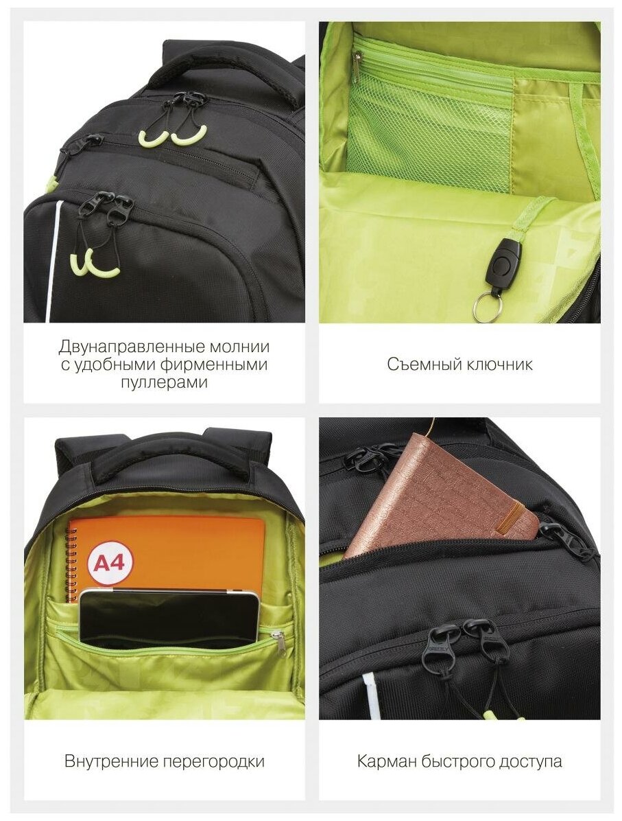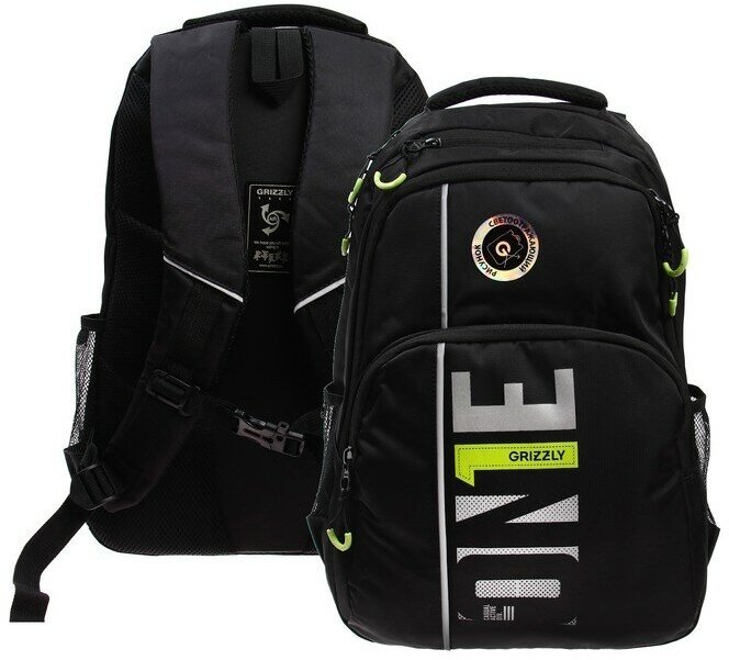 Школьный рюкзак с ортопедической спинкой GRIZZLY RU-330-5 черный-салатовый, грудная стяжка, 32х45х23см, 2 отделения, 20.5л