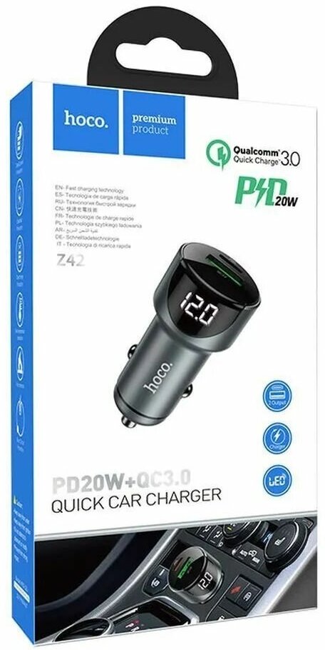 Автомобильная зарядка HOCO Z42 Light Road 1xUSB, 1xUSB-C, 3А, PD20W, QC3.0, LED дисплей (серая)