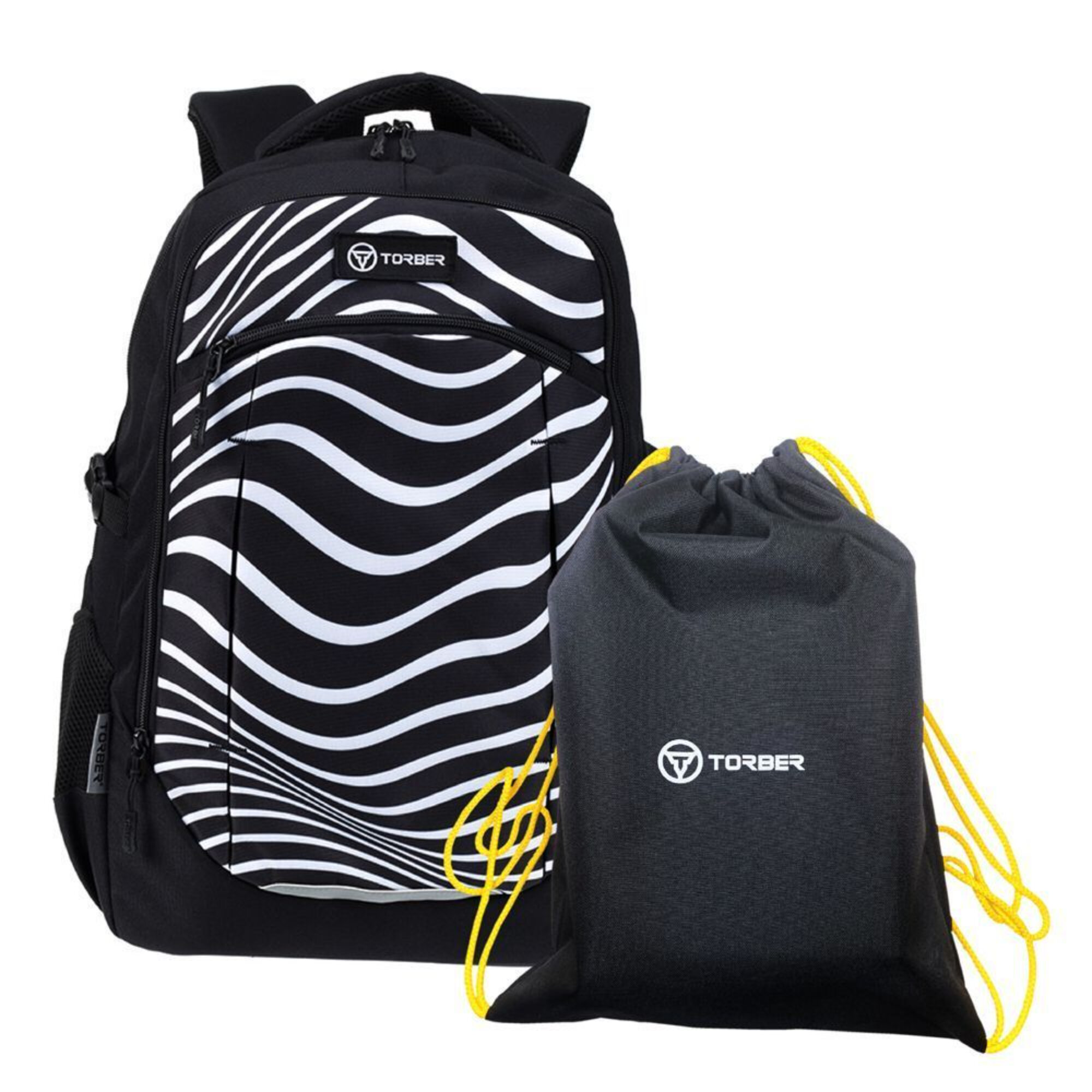 Школьный рюкзак TORBER CLASS X, черно-серый с принтом "Зебра", полиэстер 900D, 46 x 32 x 18 см, 21 л +Мешок для сменной обуви в подарок!