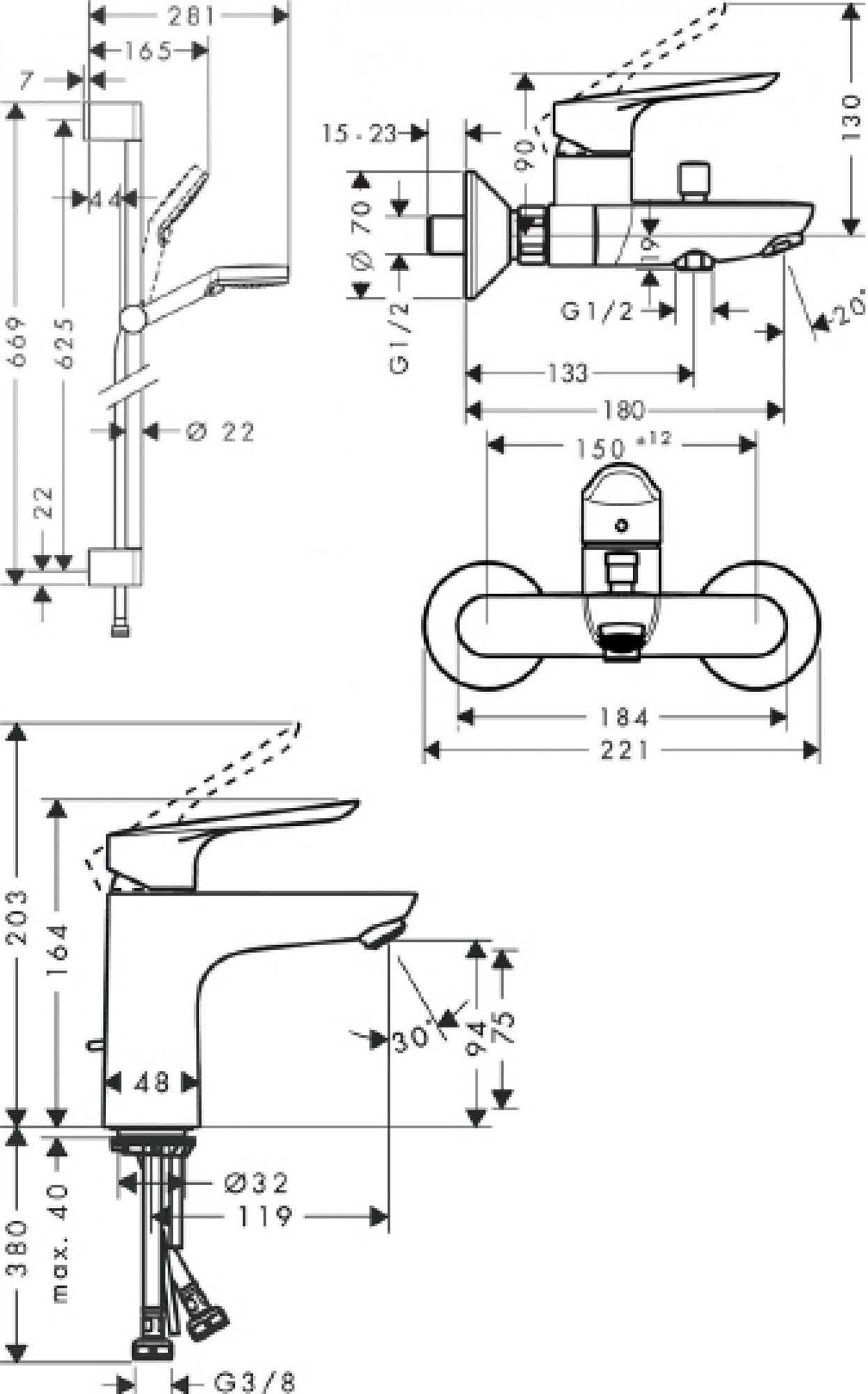 | Комплектация | смеситель для раковины Logis E 100 / с донным клапаном (71178000) / смеситель для ванны Logis E / внешний монтаж (71415000) / душевой набор Crometta Vario Unica 650 mm (26532400) |
