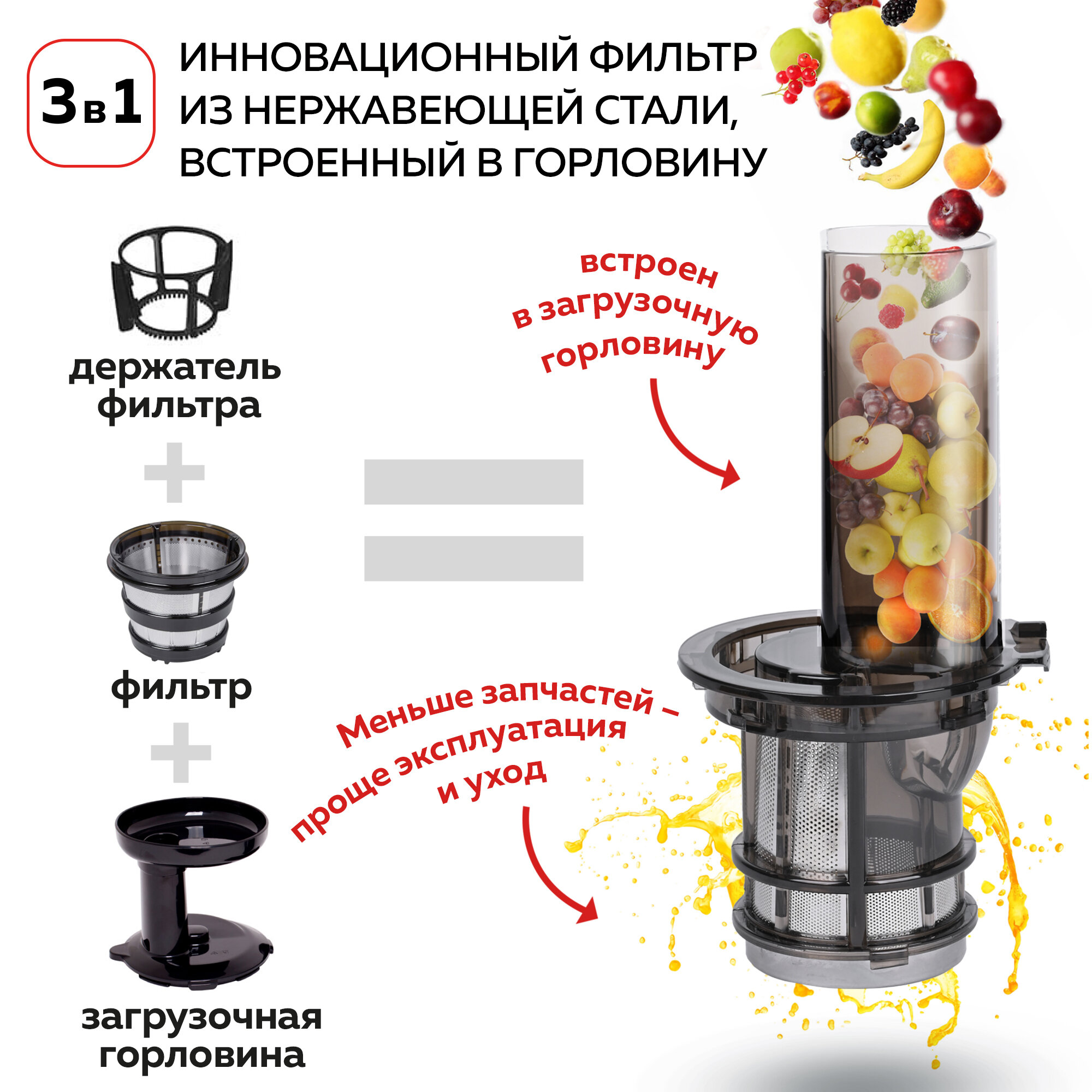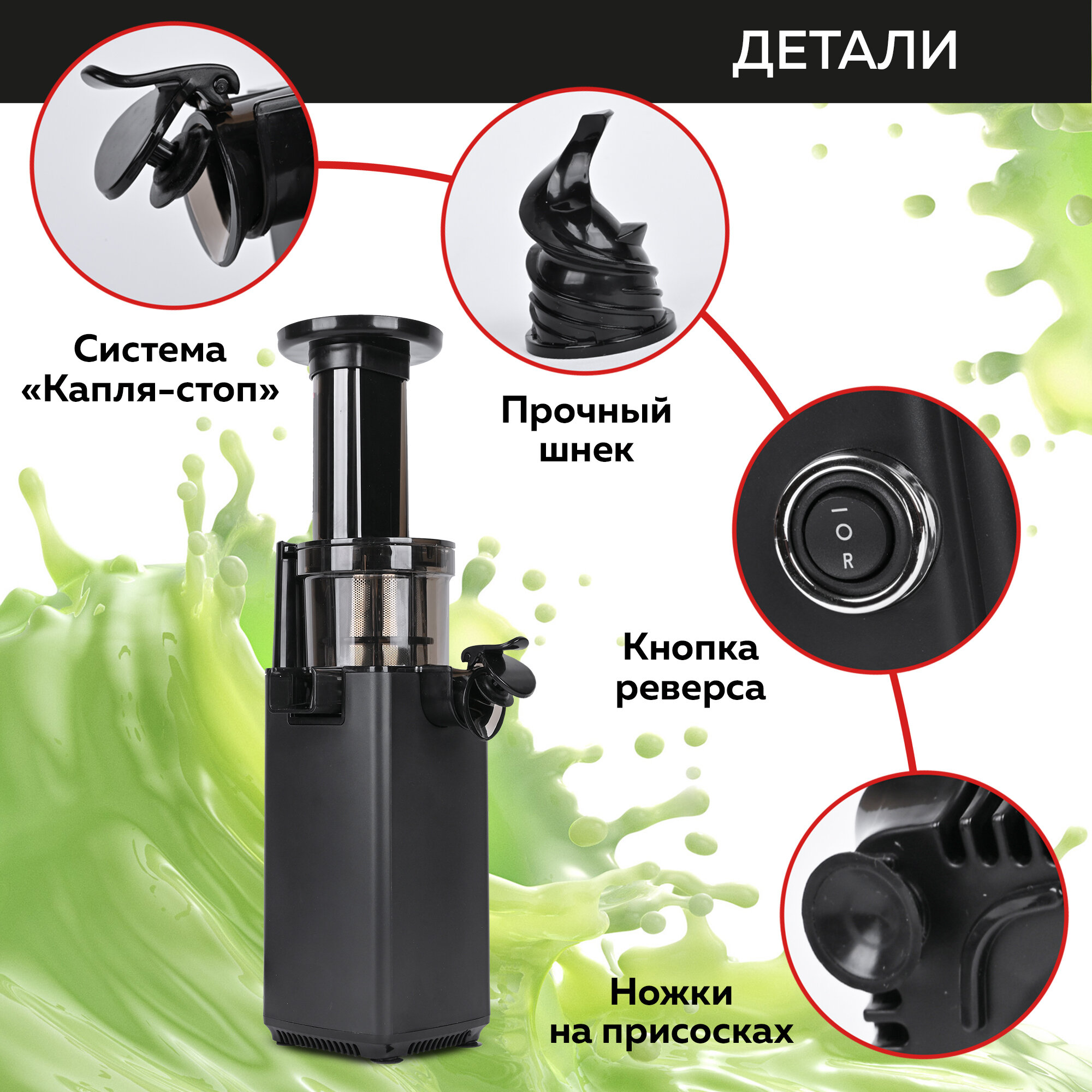 | Особенности | система прямой подачи сока / система «капля-стоп» / автоматический выброс мякоти / защита от перегрузки / реверс |