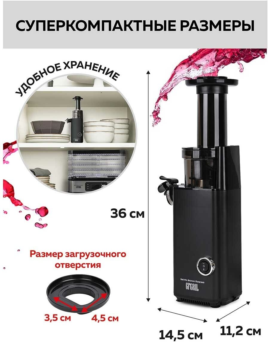 СохранитьGFGRIL Соковыжималка шнековая 2 в 1 GF-J10 с насадкой для приготовления сорбета, суперкомпактная соковыжималка электрическая для цитрусовых интересное: