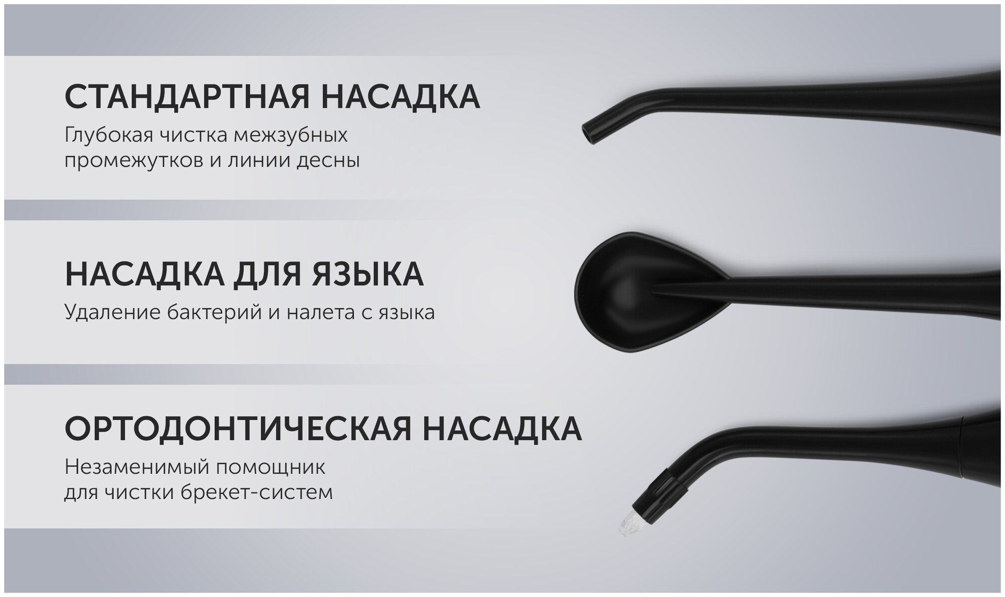 | Насадки | для струйной чистки / для чистки языка / ортодонтическая (для брекетов) |