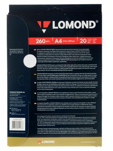 Купить Фотобумага Lomond A4, для струйной печати, 20л, 260г/м2, белый, покрытие высокоглянцевое [1103101]