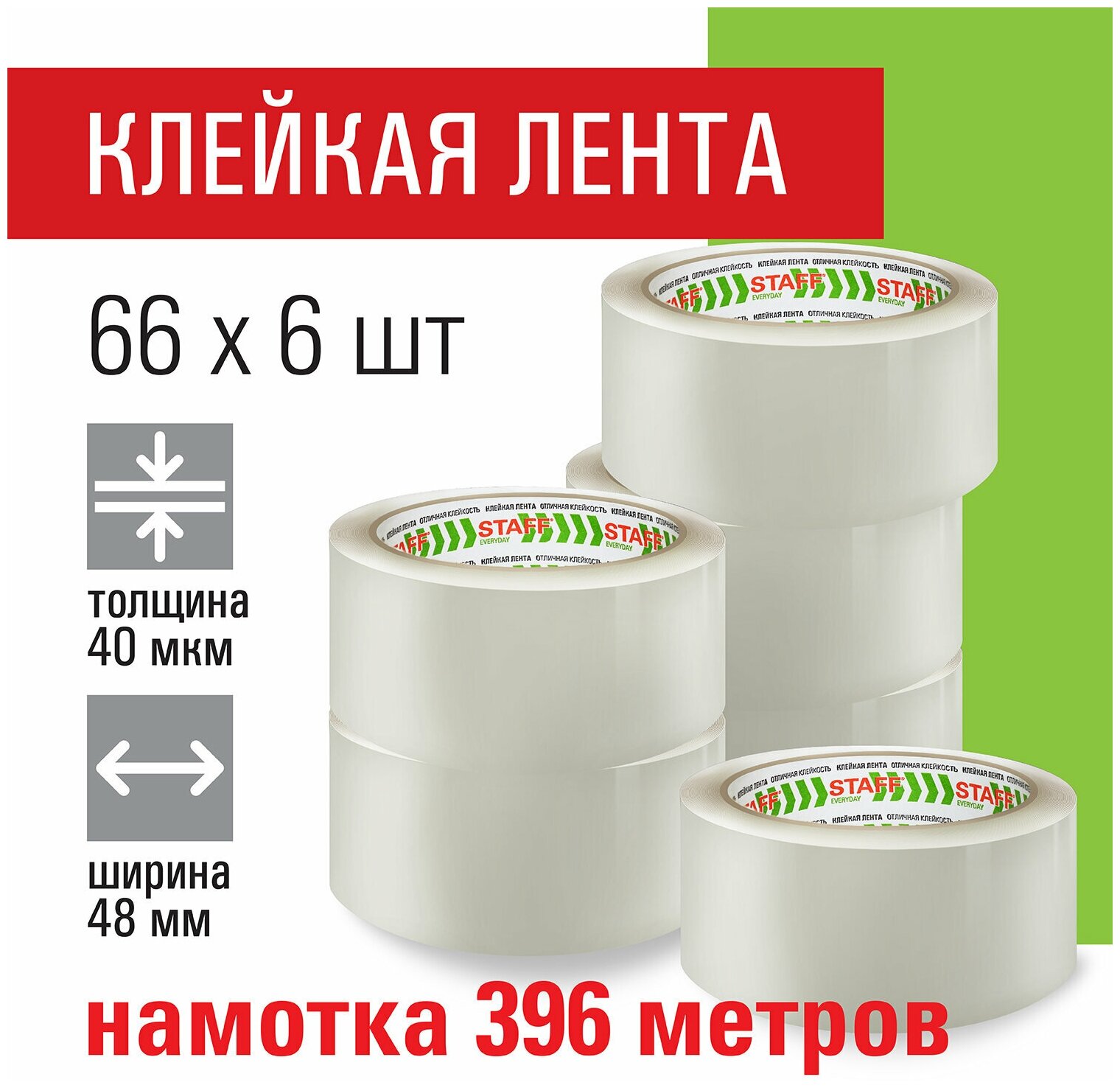 Клейкие ленты STAFF упаковочные 48 мм х 66 м, комплект 6 шт., прозрачные, 40 микрон, BIG PACK, 440179