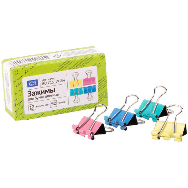 Зажимы для бумаг 15мм, OfficeSpace, 12шт., цветные, картонная коробка ( Артикул 257951 )
