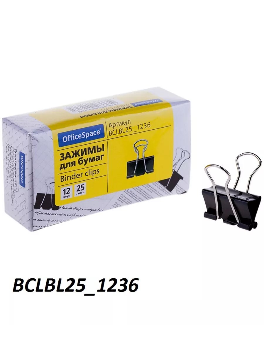 Купить Зажимы для бумаг металлические OfficeSpace (25мм, до 100 листов, черные) в картонной коробке, 12шт. (BCLBL25_1236)