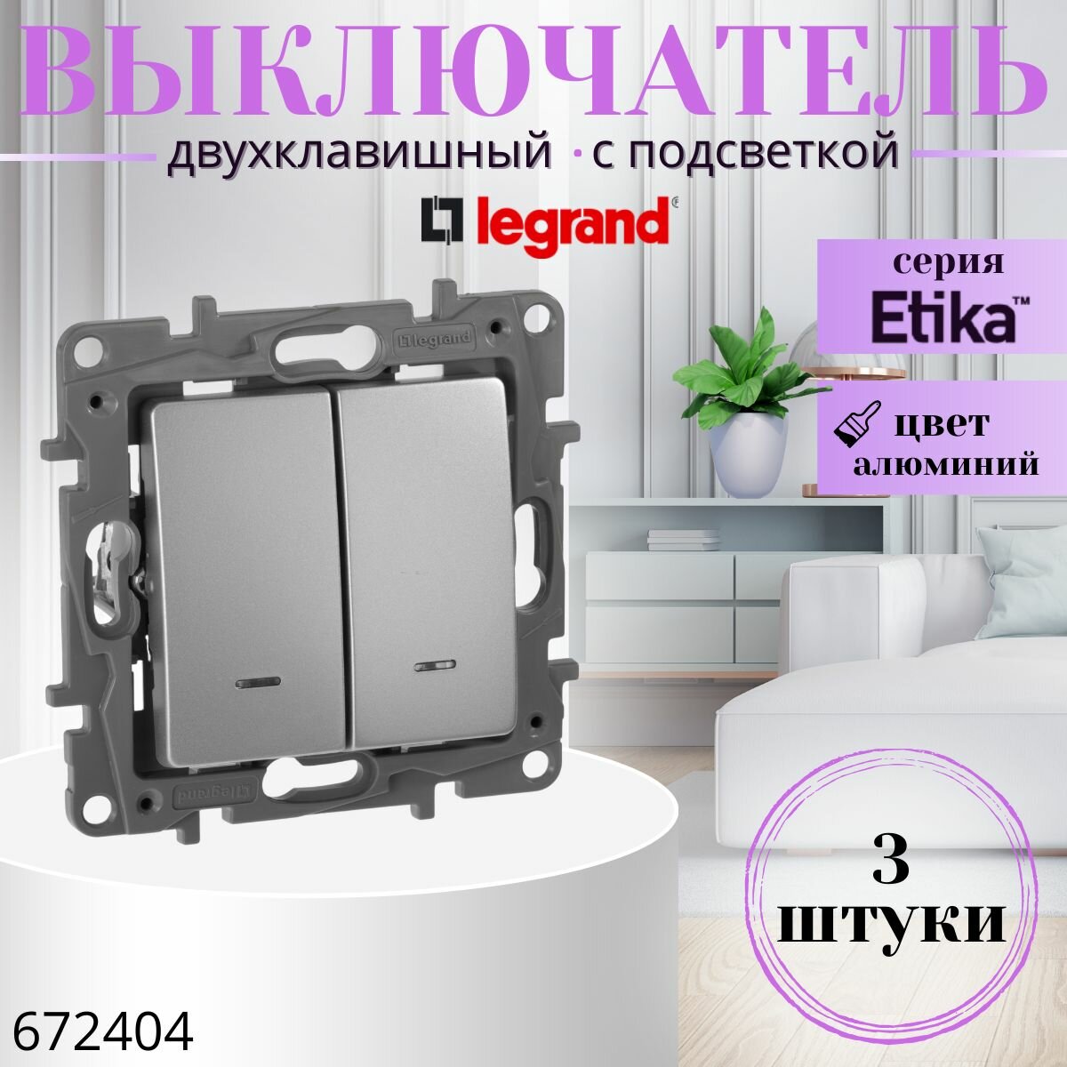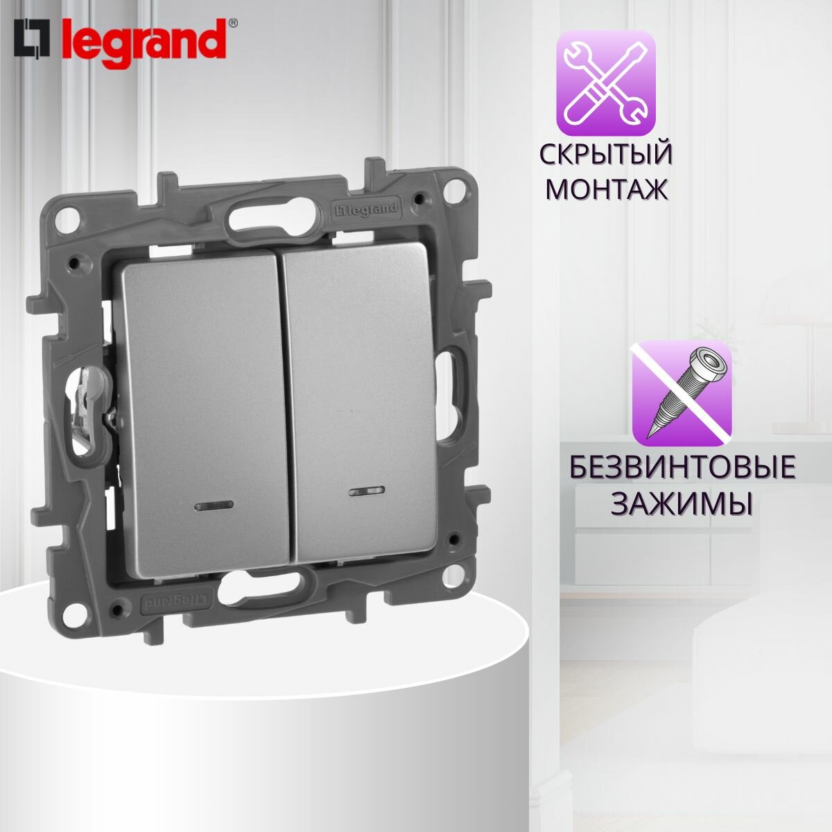 Выключатель Legrand Etika 672404 двухклавишный скрытая установка алюминий с подсветкой