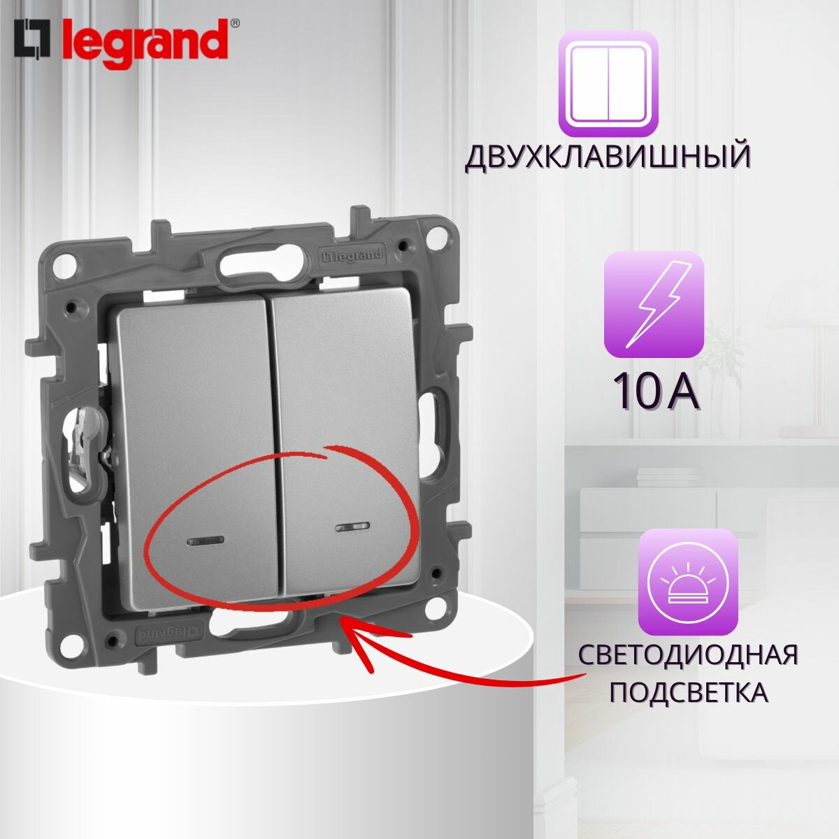 Легранд Этика 672404 выключатель двухклавишный с подсветкой алюминий / LEGRAND Etika 672404 выключатель двухклавишный с/у с подсветкой алюминий