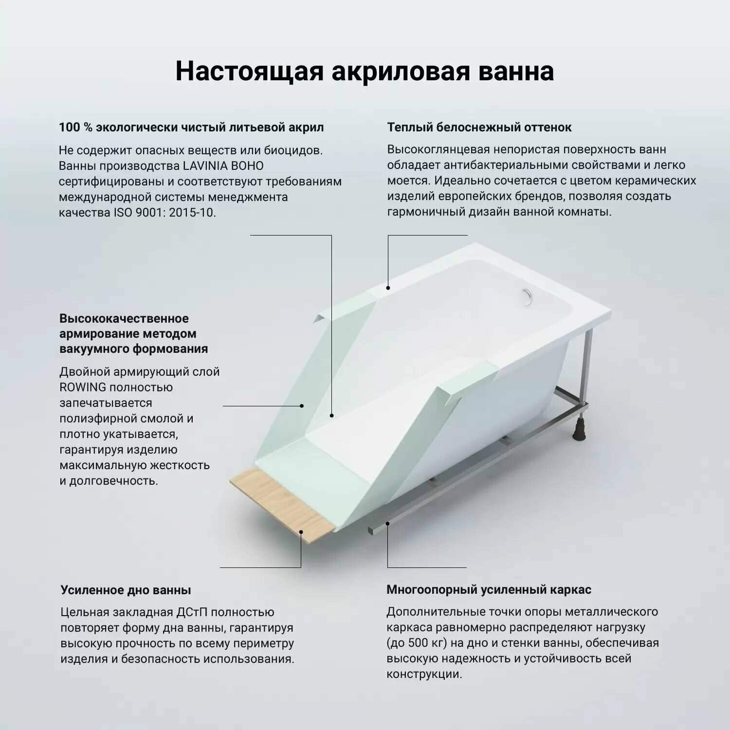 Ванна акриловая 180х80 Lavinia Boho One S2-3701008P в наборе 4 в 1: прямоугольная ванна 180 х 80 см, усиленный металлический каркас, мягкий подголовник, лицевой экран интересное: