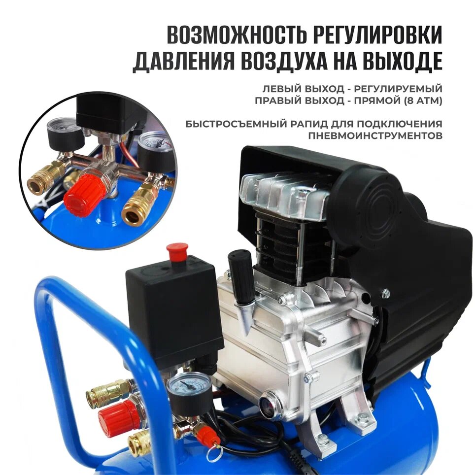 Хороший компрессор. Два выхода один прямой другой с регулятором. В комплекте есть масло, воздух совсем не травит. Да и по внешнему виду качество хорошее. Для своей мастерской советую на все 100.