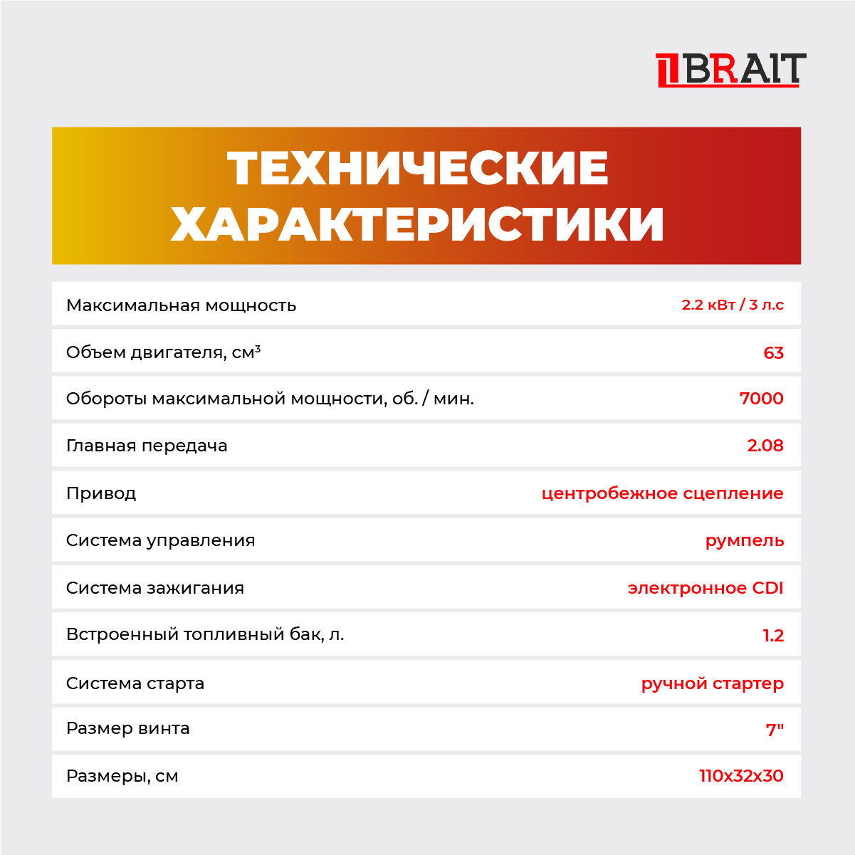 | Дополнительная информация | система подачи топлива: карбюратор; топливный бак: встроенный; тип смазки: смесь; максимальные обороты двигателя: 7000 об/мин |