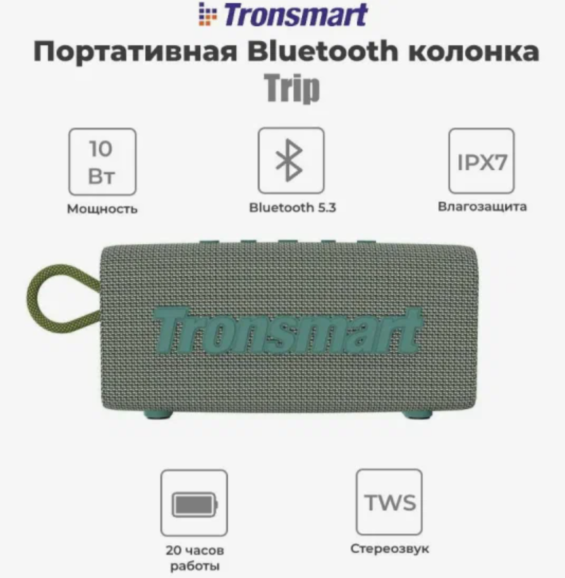 | Дополнительная информация | портативный наружный динамик Tronsmart Trip, 3,5 мм аудиокабель, кабель для зарядки Type-C, гарантийный талон, руководство пользователя |