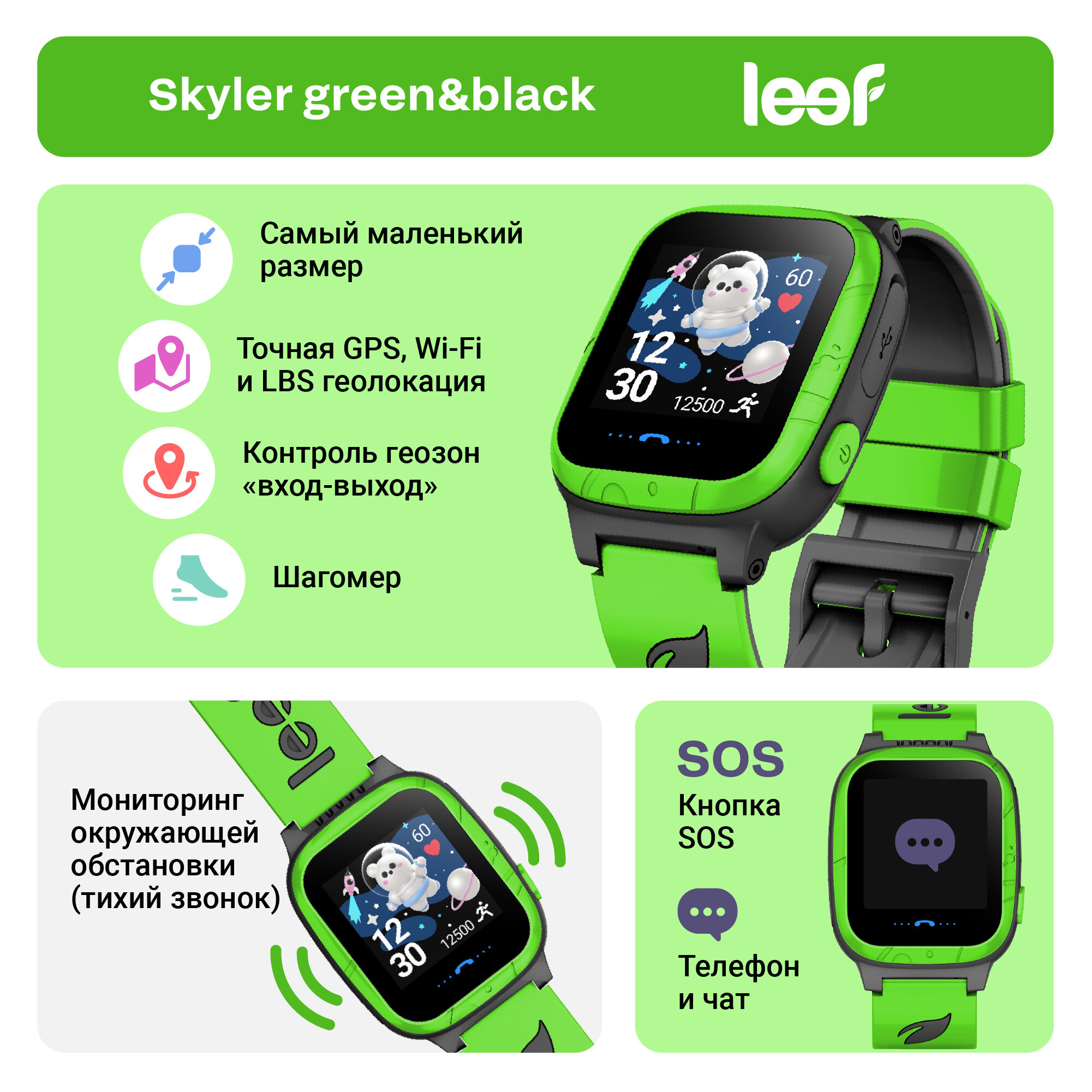 Детские умные часы Leef Skyler Wi-Fi, black/green