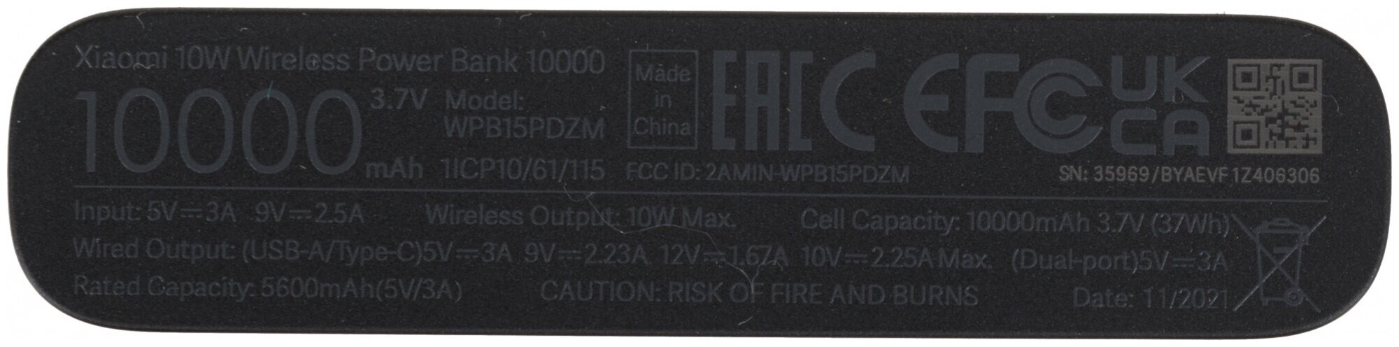 Внешний аккумулятор Xiaomi Mi 10W Wireless (BHR5460GL), USB/USB-C, 3 А, 10000 мАч, черный