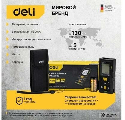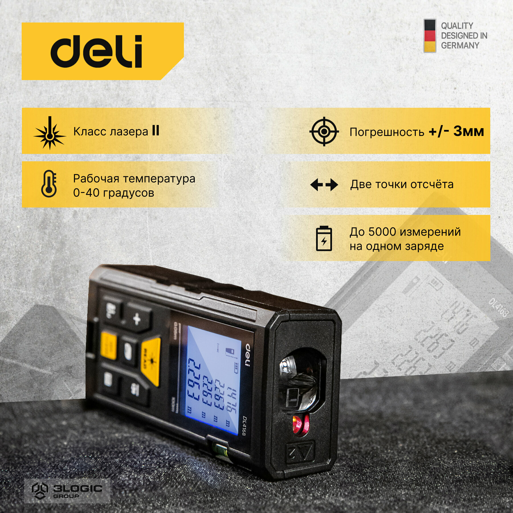 Лазерный дальномер Deli DL4168 (Диапазон измерения 0,05-40м, точность 3мм, дисплей 1,7 дюймов,авто. отключение)