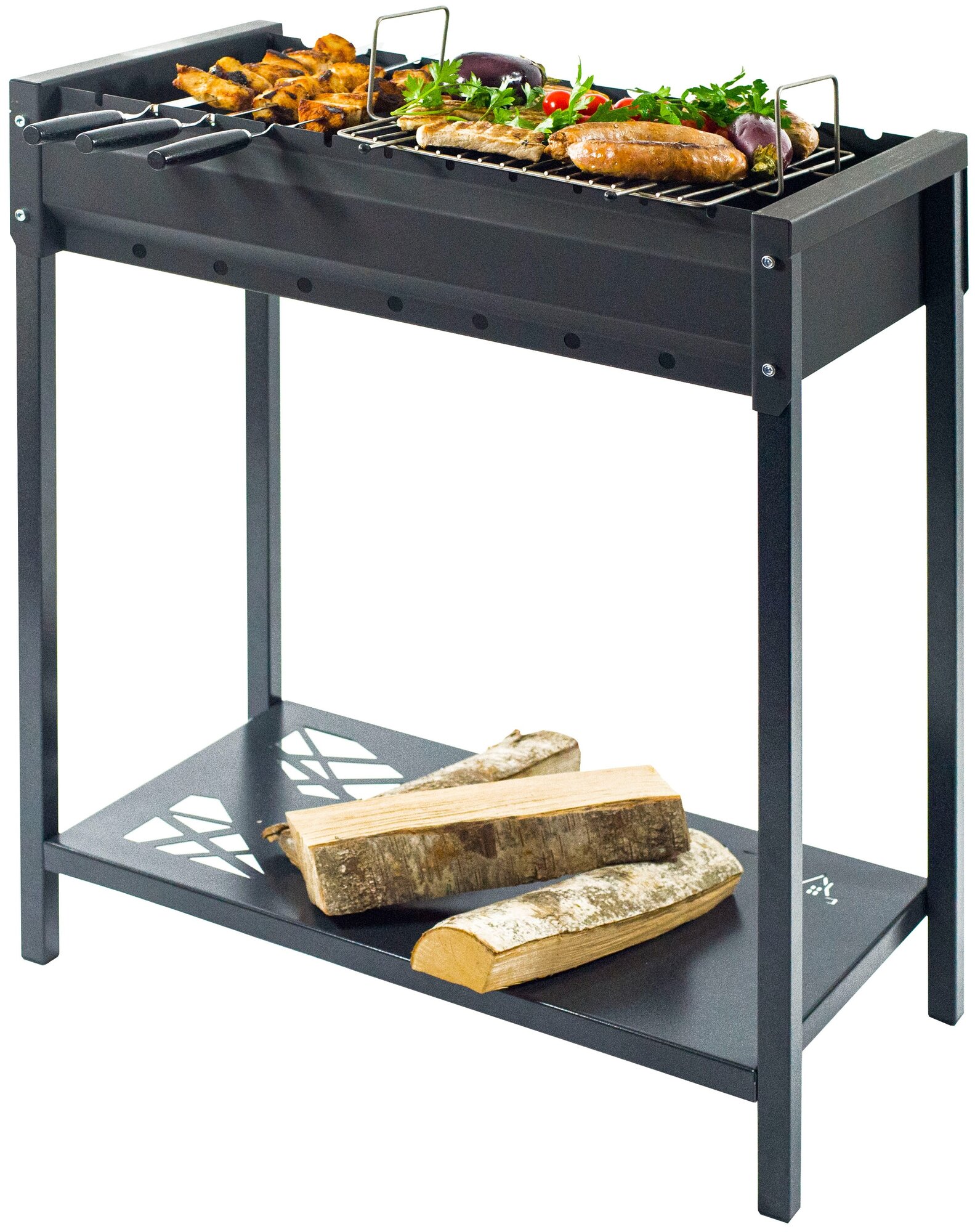 | Плюсы: | Крепкая, надёжная конструкция. Достаточно вместительный: можно одновременно разместить и решетку и несколько шампуров. |