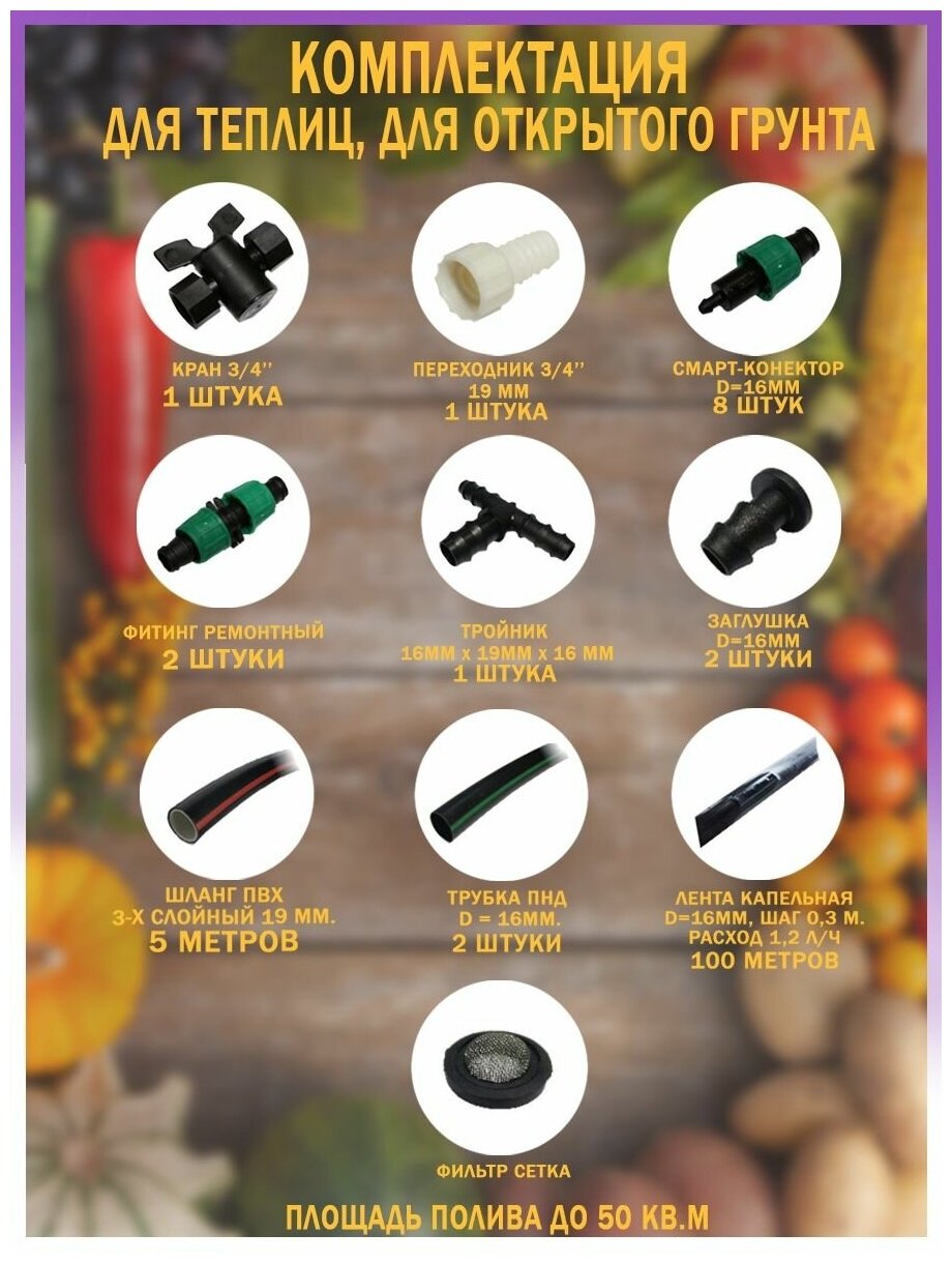 | Комплектация | кран 3/4" - 1 шт, переходник 3/4" - 1 шт, фитинг ремонтный 16 мм - 1 шт, заглушка - 2 шт, трубка пнд - 3 м, фильтр сетка - 1 шт, старт коннектор - 6 шт, тройник - 1 шт, шланг пвх трехслойный - 3 м, лента капельная - 60 м |