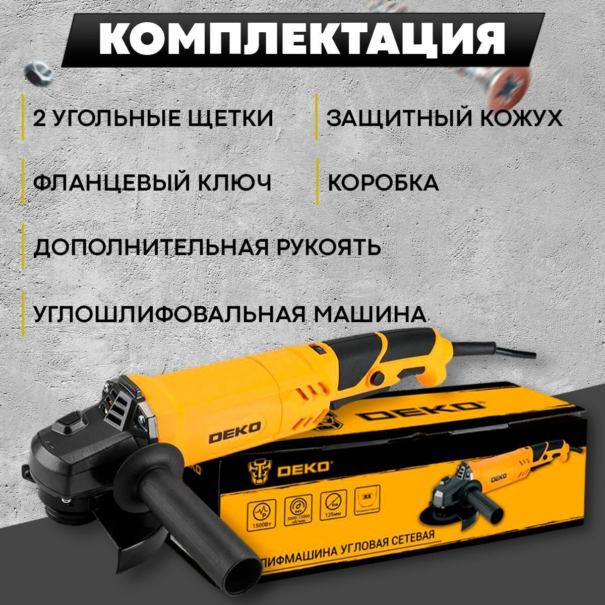 Угловая шлифмашина DEKO DKAG1500, 1500 Вт, 125 мм, 3000-12000 об/мин, регулировка скорости 9425767