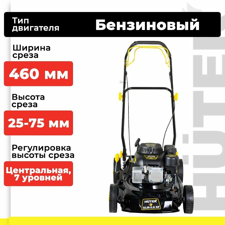 Газонокосилка бензиновая самоходная HUTER GLM-5.0SP, 5 л. с, ширина скоса 46см, пластиковый травосборник на 50л