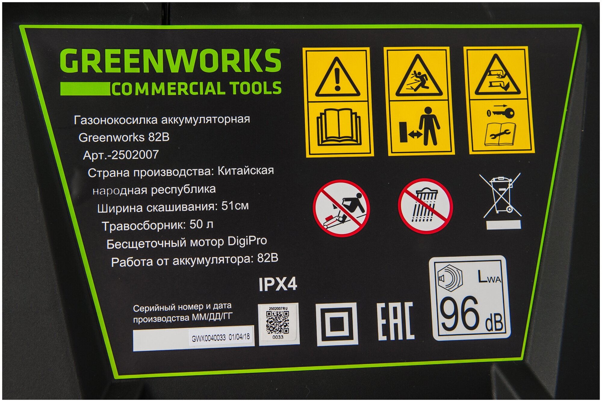 Газонокосилка аккумуляторная GreenWorks GD82LM51, 82V, 51 см, бесщеточная, без АКБ и ЗУ