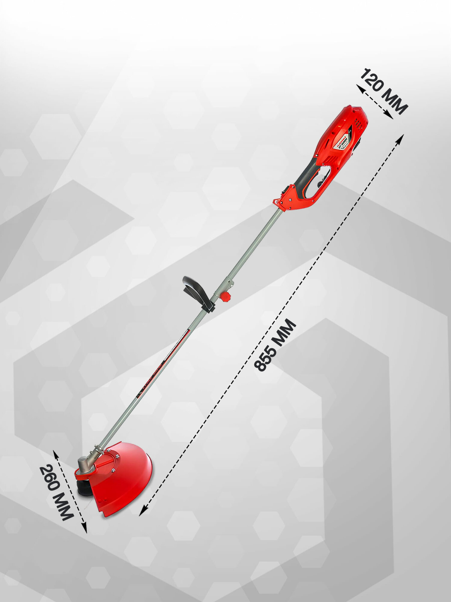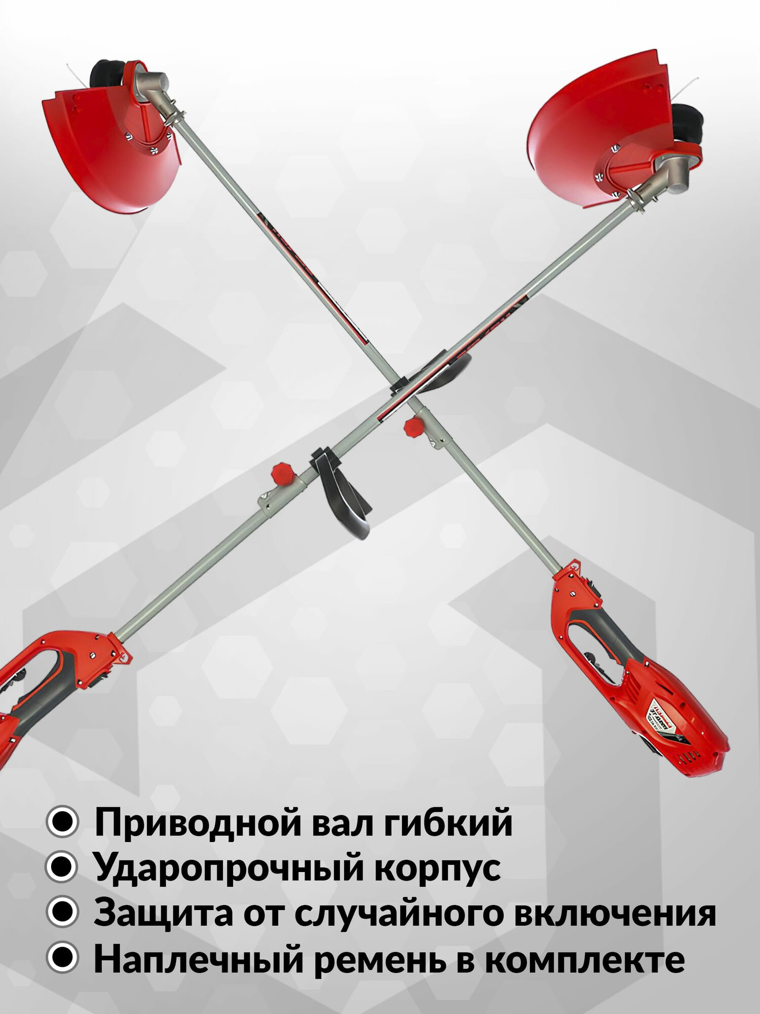 | Особенности | ширина скашивания с помощью ножа - 23 см; полуавтоматическая катушка; разборная штанга; функция плавного пуска; питание от сети переменного тока напряжением 230 В, частотой 50 Гц; ударопрочный корпус; защита от случайного включения |