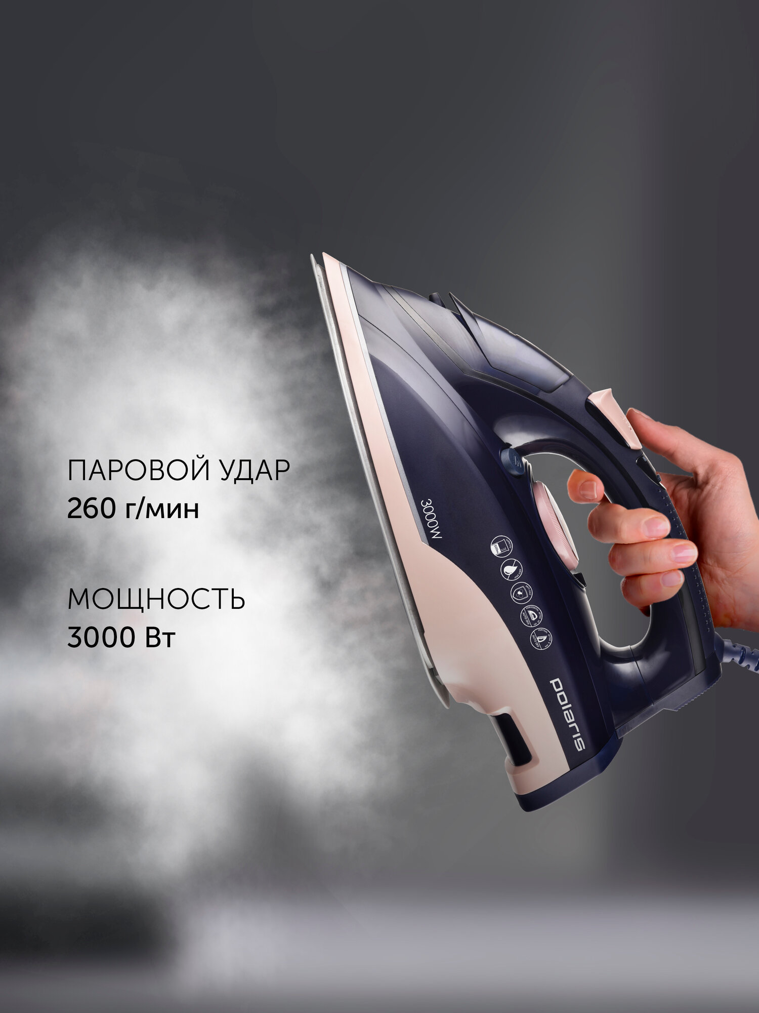 Паровой утюг Polaris PIR 3074 SG AA 3m, встроенный парогенератор, мощность 3000 вт, синий/розовый