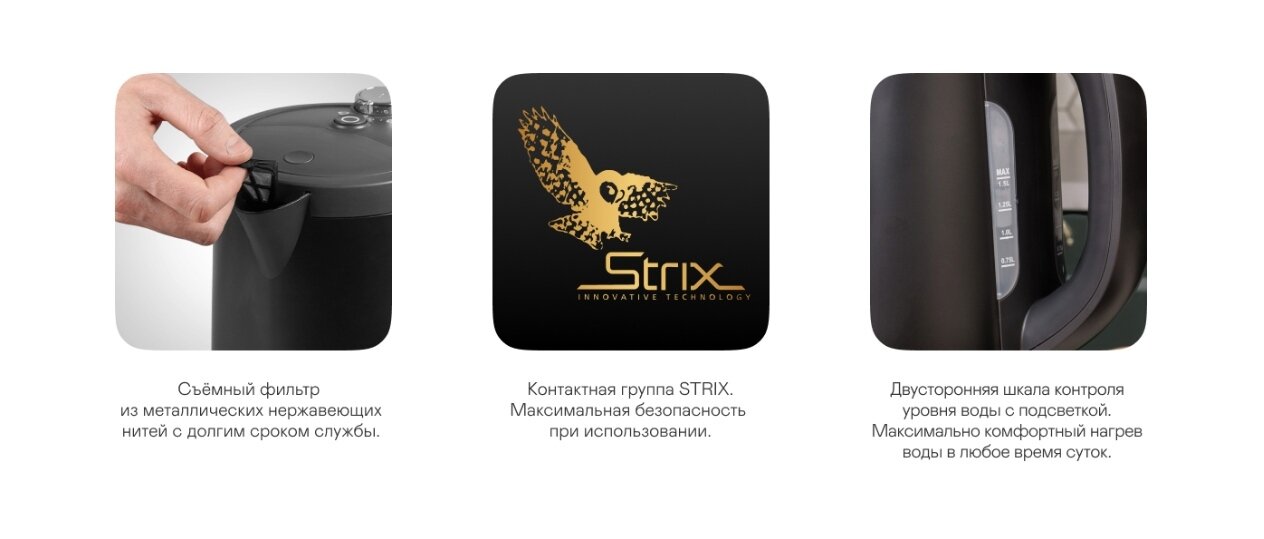 | Плюсы: | Сделан идеально, никаких щелей или кривых кнопок, пластик не пахнет, металлические части ровненькие и т.д. Электрическая часть Strix, я не большой спец, консультант сказал, что это круто, я мельком погуглила на месте – действительно круто и надежно)) И дается гарантия два года, для чайника что-то неслыханное.
