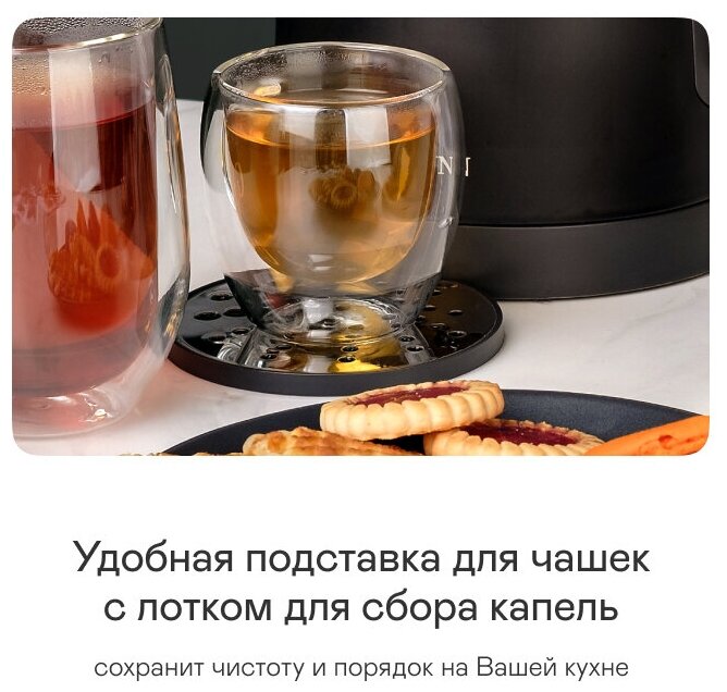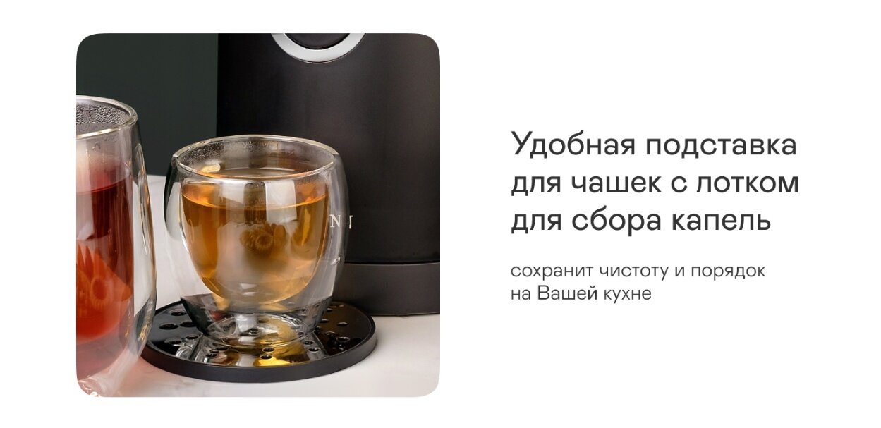 Еще супер находка - подставка с лотком для сбора капель. Использую ее постоянно, она удобная и красивая. С дозатором при правильной настройке ничего не проливается, но под горячее подставка все равно напрашивается. Подходит под любую ширину чашки, легко моется. Чайник быстро кипятит воду, особенно небольшую порцию, работает не шумно. С 1,5 литрами тоже справляется хорошо. |