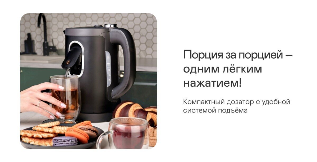 | Плюсы: | Крутой чайник, быстрый нагрев, удобный дозатор, хорошая цена |