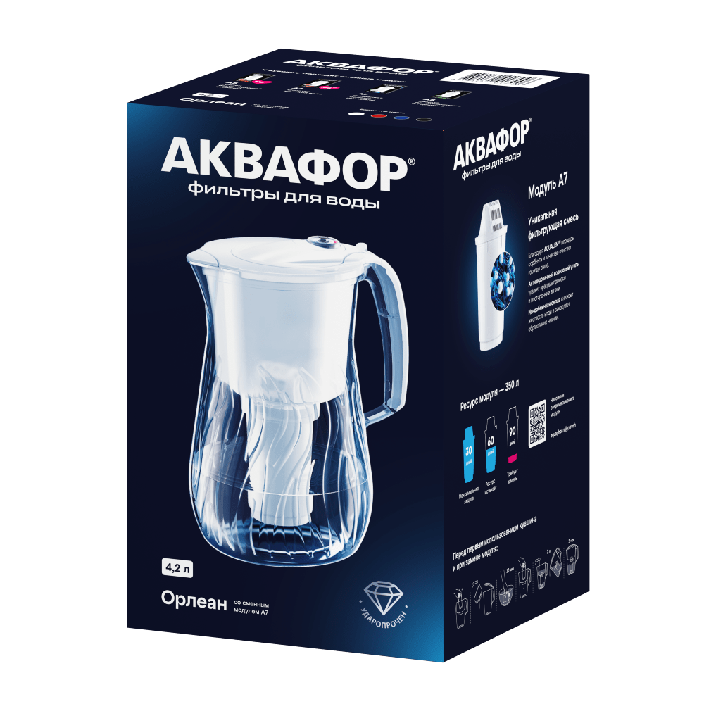 | Дополнительная информация | комплектация: сменный фильтрующий модуль A7, кувшин, воронка, крышка флип-флоп с механическим счетчиком; материал кувшина – сополиэфир Eastman TritanTM |