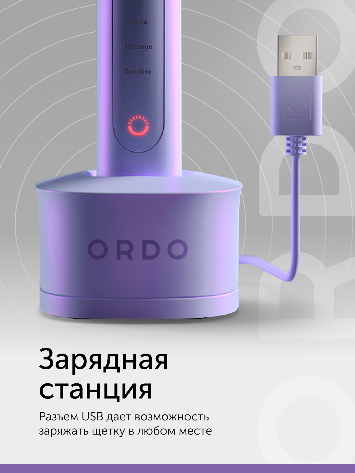 Электрическая зубная щетка ORDO Sonic+ звуковая, 4 режима чистки, таймер на 2 мин, USB зарядка, с влагозащитой, фиолетовая
