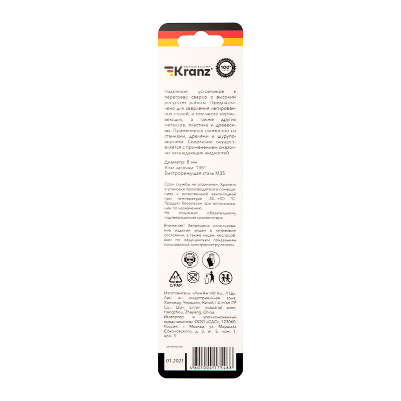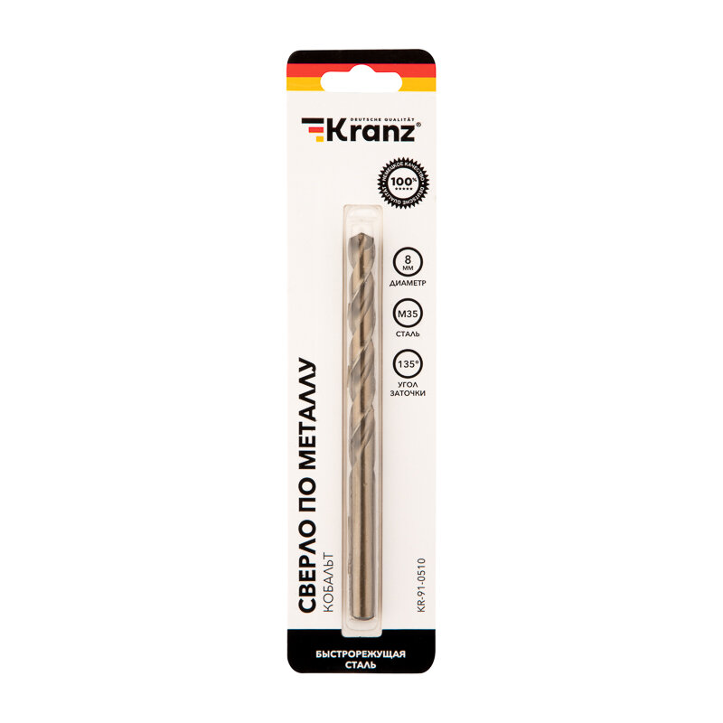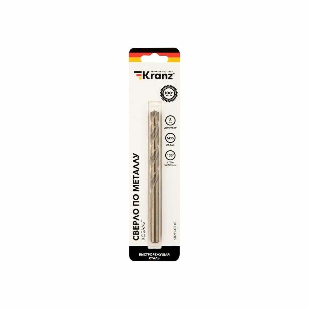 Купить Сверло по металлу 8мм «Кобальт» (сталь HSS-Co 5% M35 P6M5K5) DIN 338 (блист.1шт) Kranz KR-91-0510
