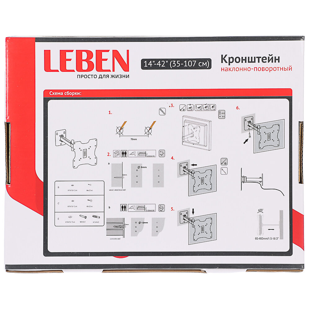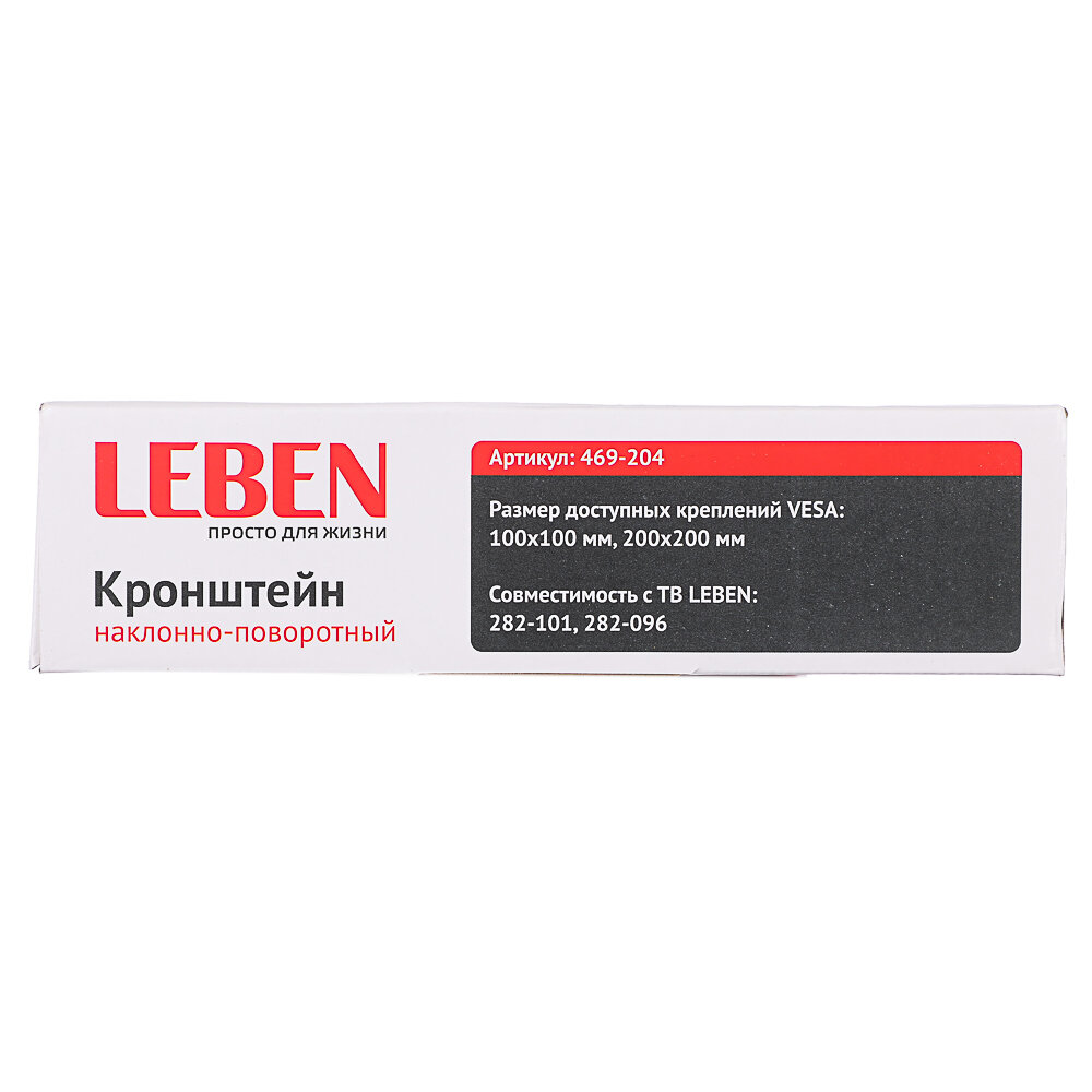 Ниже Вы можете прочитать отзывы на LEBEN Кронштейн для ТВ наклонно-поворотный, 14"-42", до 30кг, 100x100 до 200x200мм, мет, ознакомится с подробными характеристиками, посмотреть интересные обзоры и фотографии на LEBEN Кронштейн для ТВ наклонно-поворотный, 14"-42", до 30кг, 100x100 до 200x200мм, мет.
