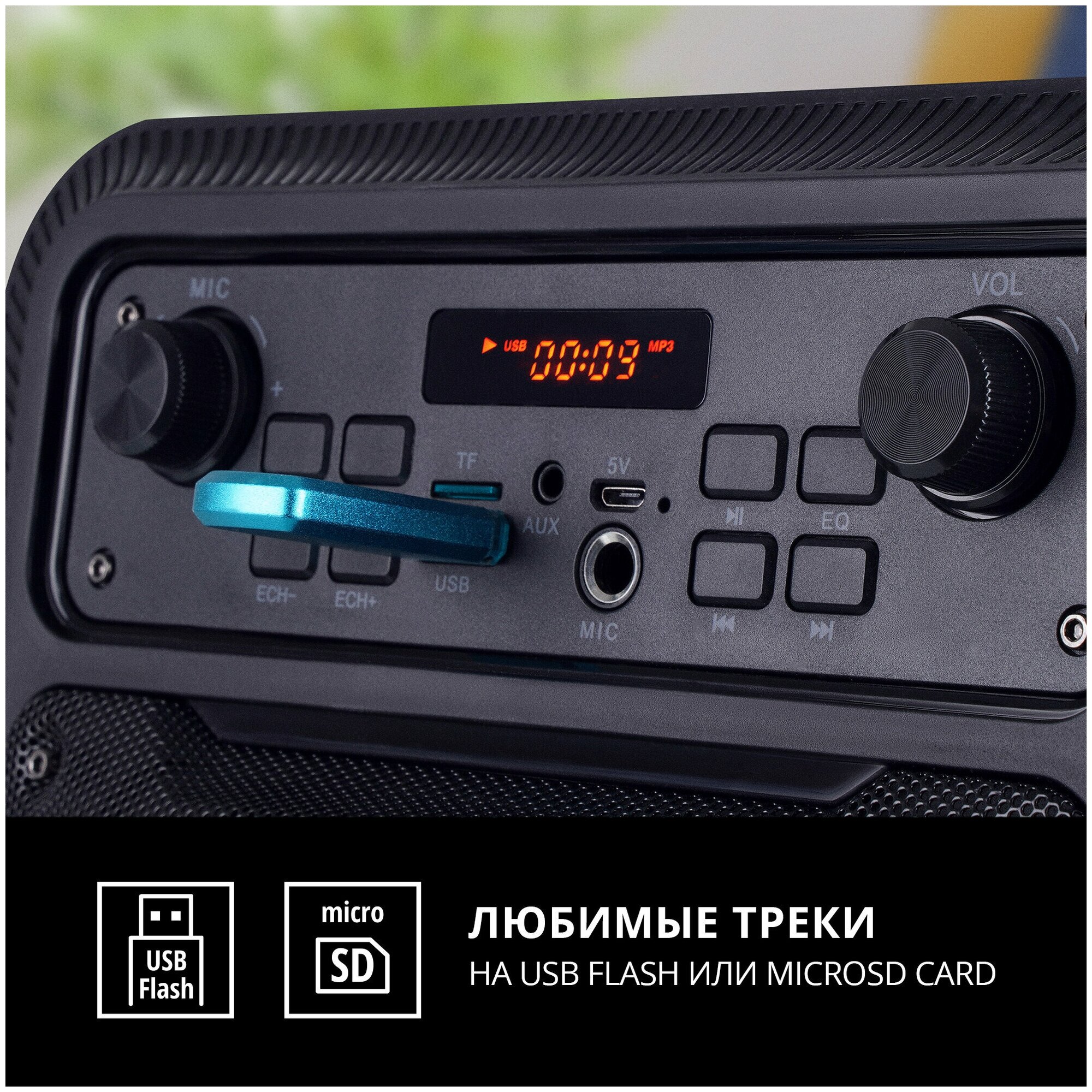 | Особенности | поддержка microSD / ручка / световые эффекты / дисплей / FM-радио |