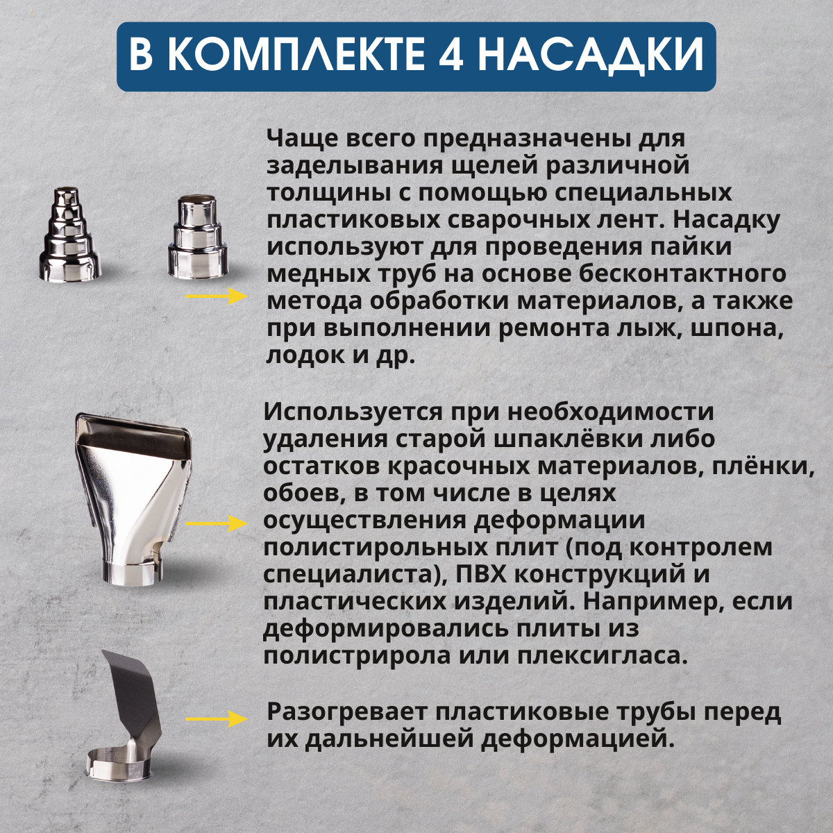 | Назначение | удаление краски / разморозка труб / размягчение покрытий / сварка пластика / изоляция проводов / подсушивание краски |