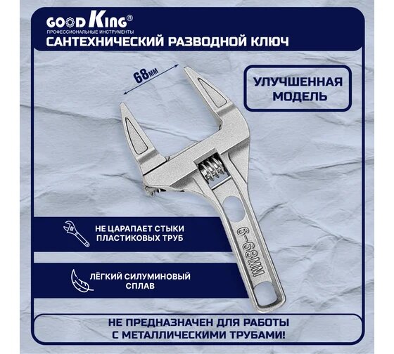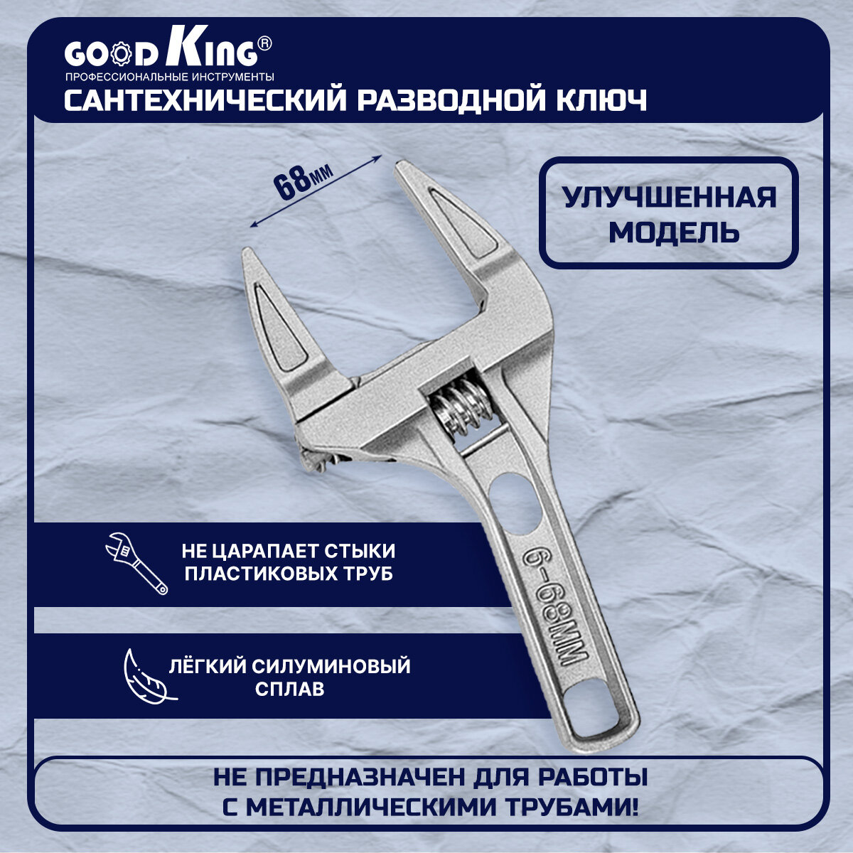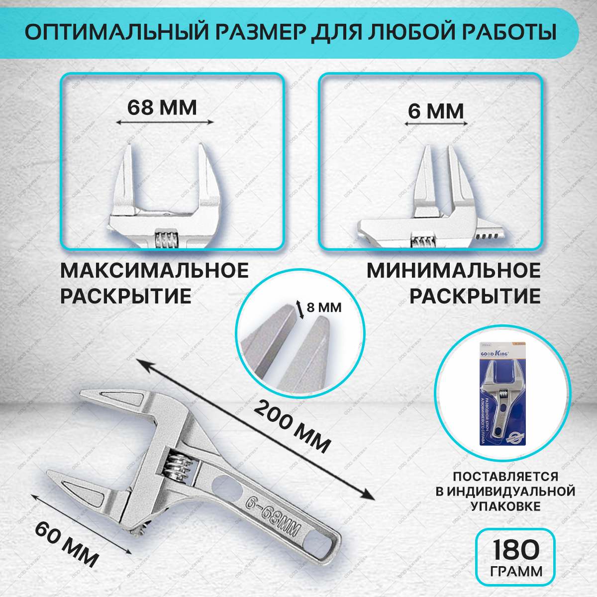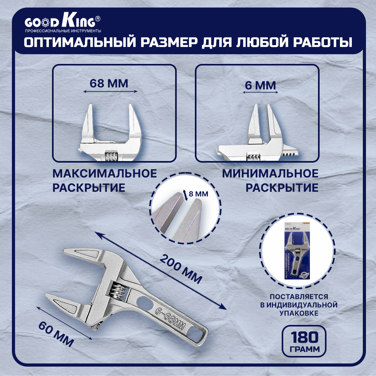 Разводной ключ GOODKING K-10001, алюминиевый 200 мм, диапазон 0-68 мм, укороченная ручка