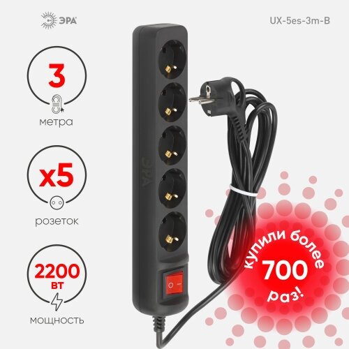Эра Б0057731 Удлинитель электрический UX-5es-3m-B с заземлением с выключателем 5 розеток 3м ПВС 3x0,75мм2 черный