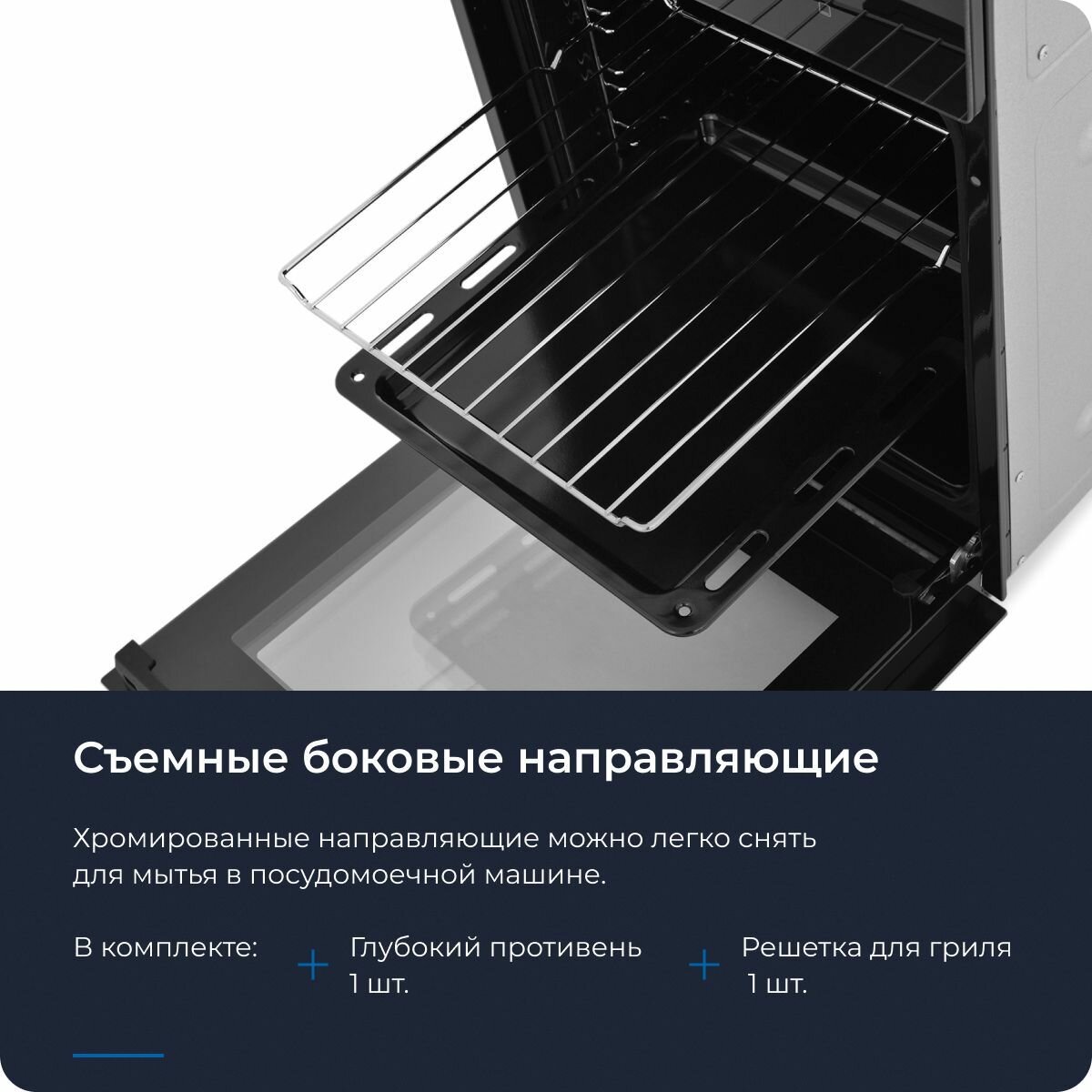Духовой шкаф электрический встраиваемый ZUGEL ZOE451B, 2200 Вт, 50 л, утапливаемые регуляторы, таймер, класс энергопотребления А, эмаль, 6 режимов работы, конвекция + гриль, черный