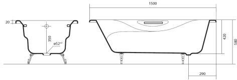AQ8050FH-00 гамма ванна чугунная эмалированная 1500x750 в комплекте с 4-мя ножками и 2-мя ручками