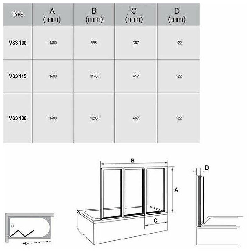 Шторка для ванны складывающаяся трехэлементная Ravak VS3 VS3 130 белая+рейн 795V010041