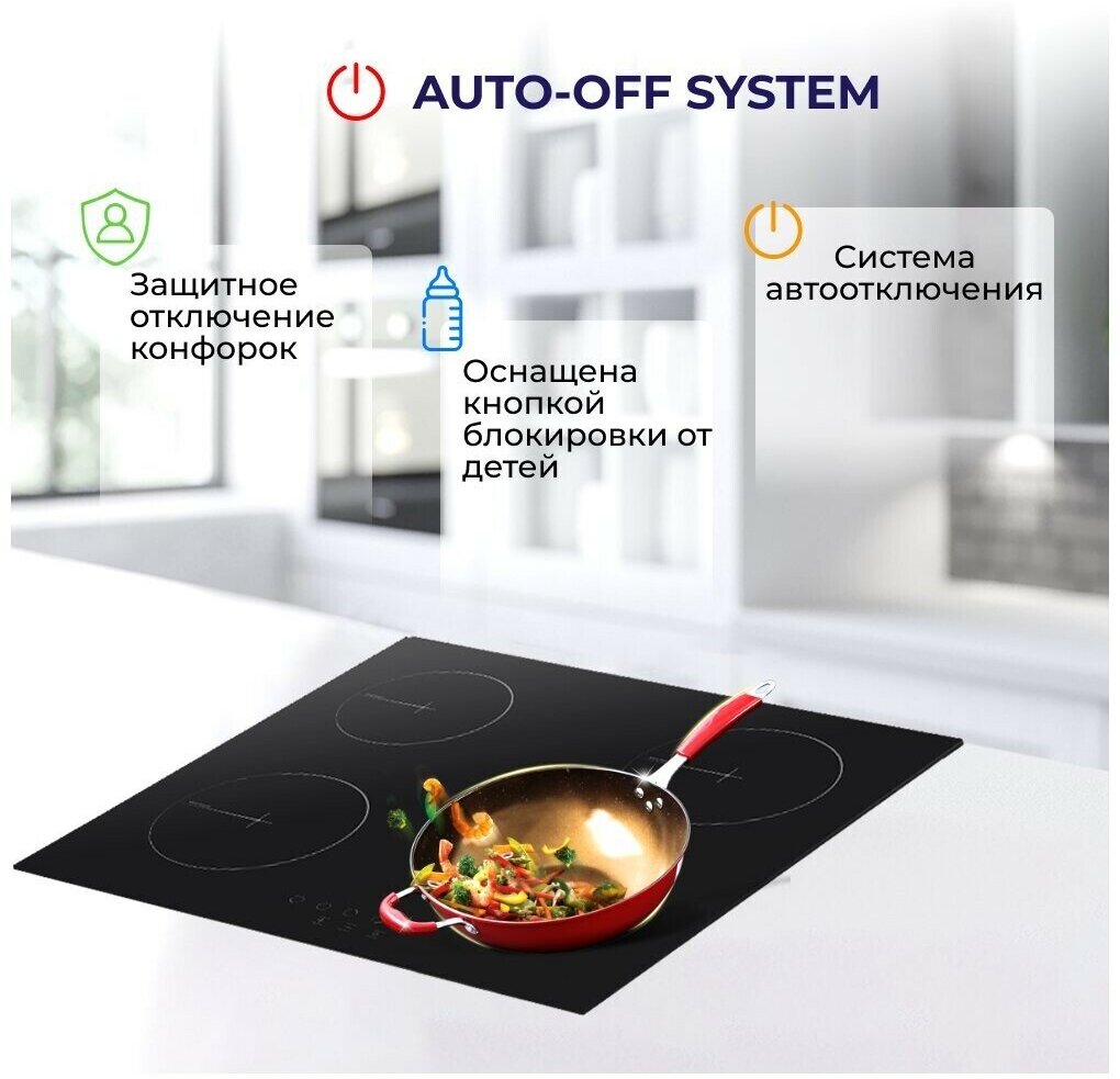 | Безопасность | защитное отключение конфорок / индикатор остаточного тепла / кнопка блокировки панели |