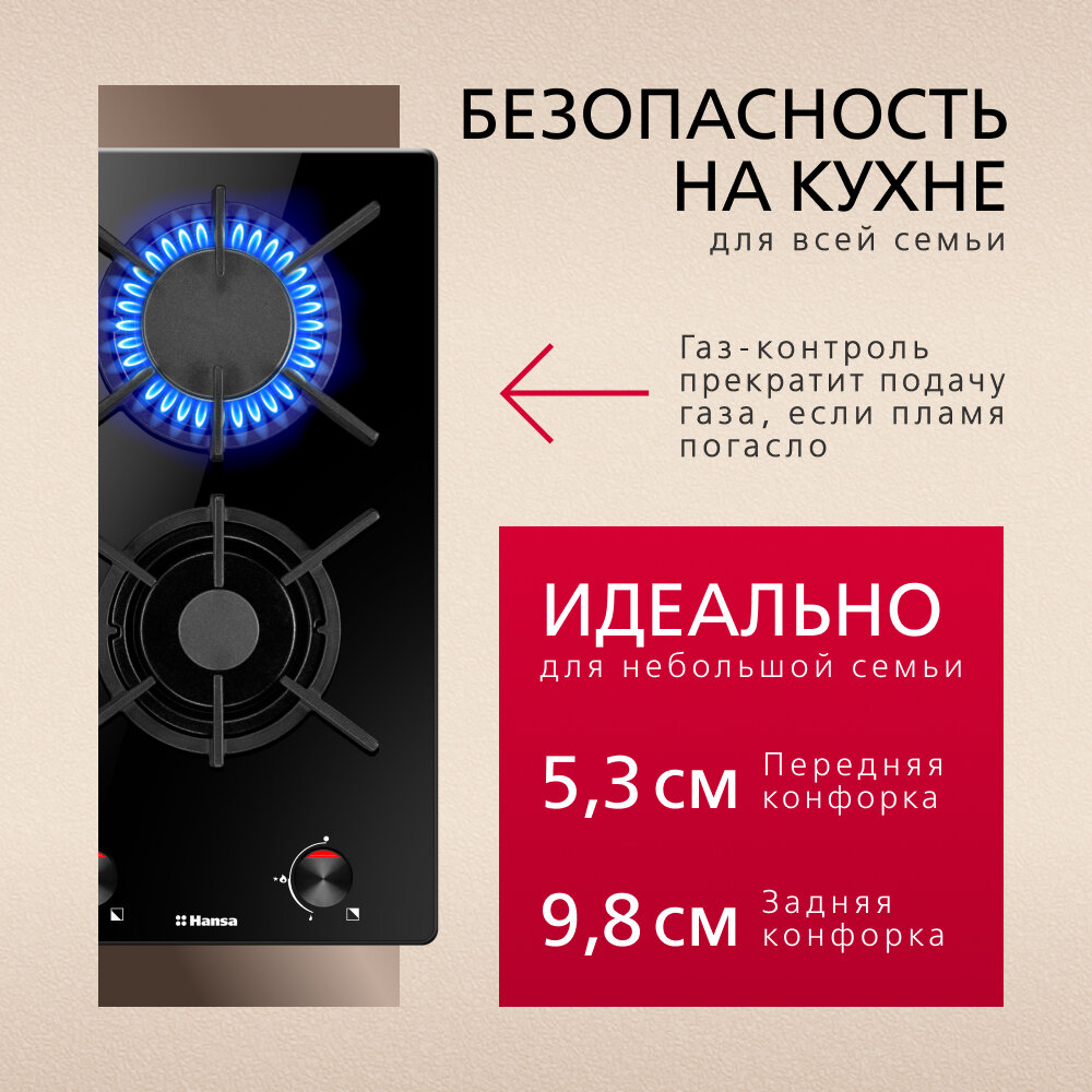 Встраиваемая варочная панель Hansa газовая 2 газовых конфороки (1х5,3см,1х9,8см), чугунные решетки, автоподжиг, газ-контроль, черный