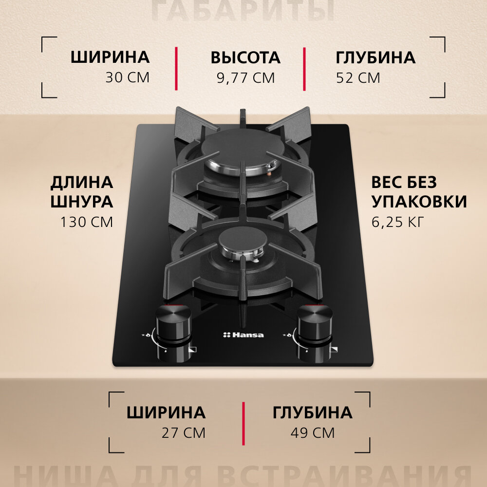 Варочная панель газовая HANSA BHKS330500 30x9.8x52 см 2 конфорки цвет чёрный