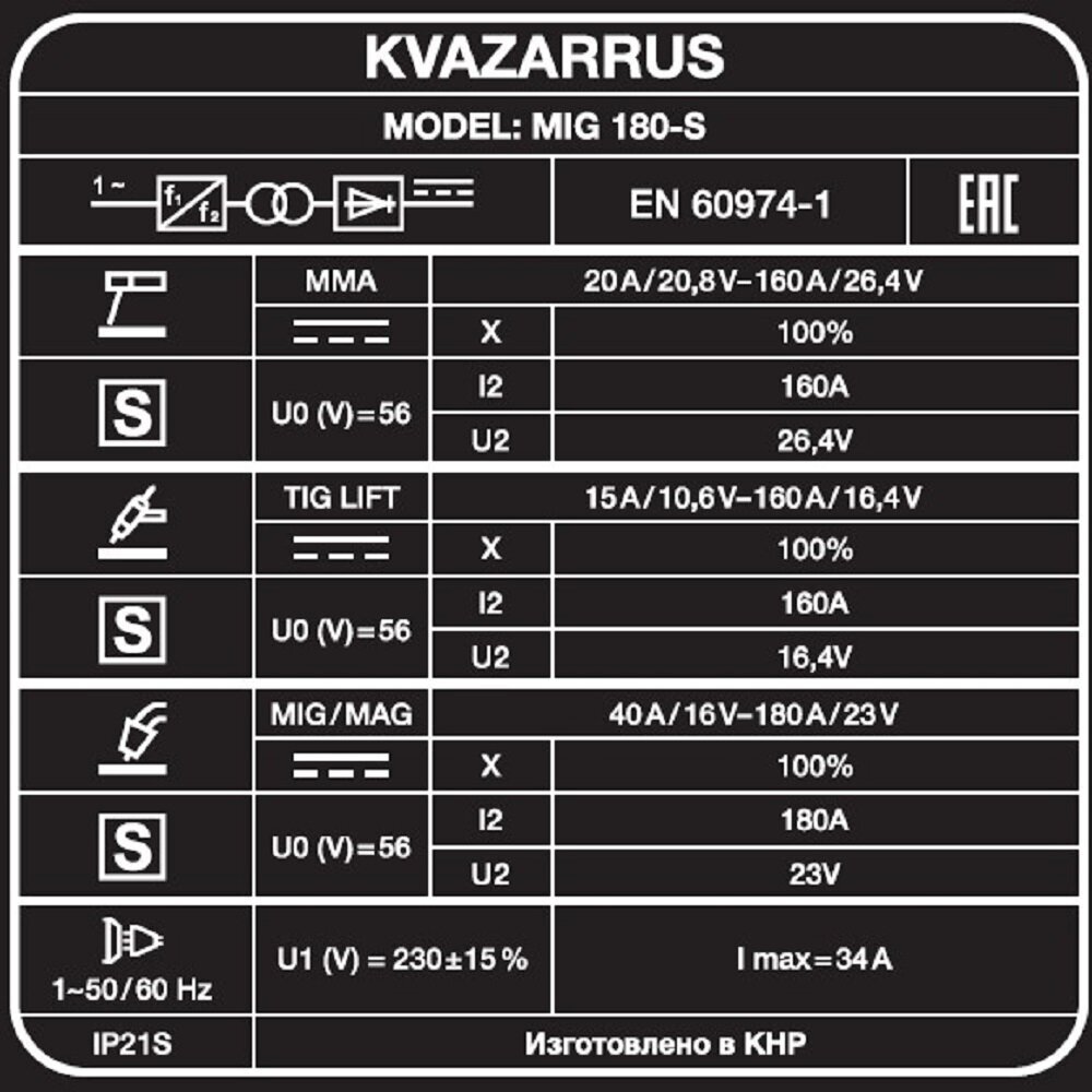 Сварочный аппарат инверторного типа Kvazarrus MIG 180-S, MMA, MIG/MAG 8.5 кг