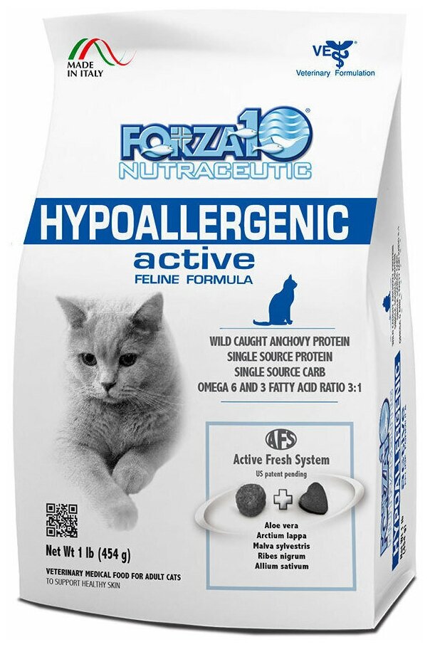 Корм Forza10 Active Hypoallergenic для кошек при пищевой непереносимости и аллергии на животный белок, 454 г