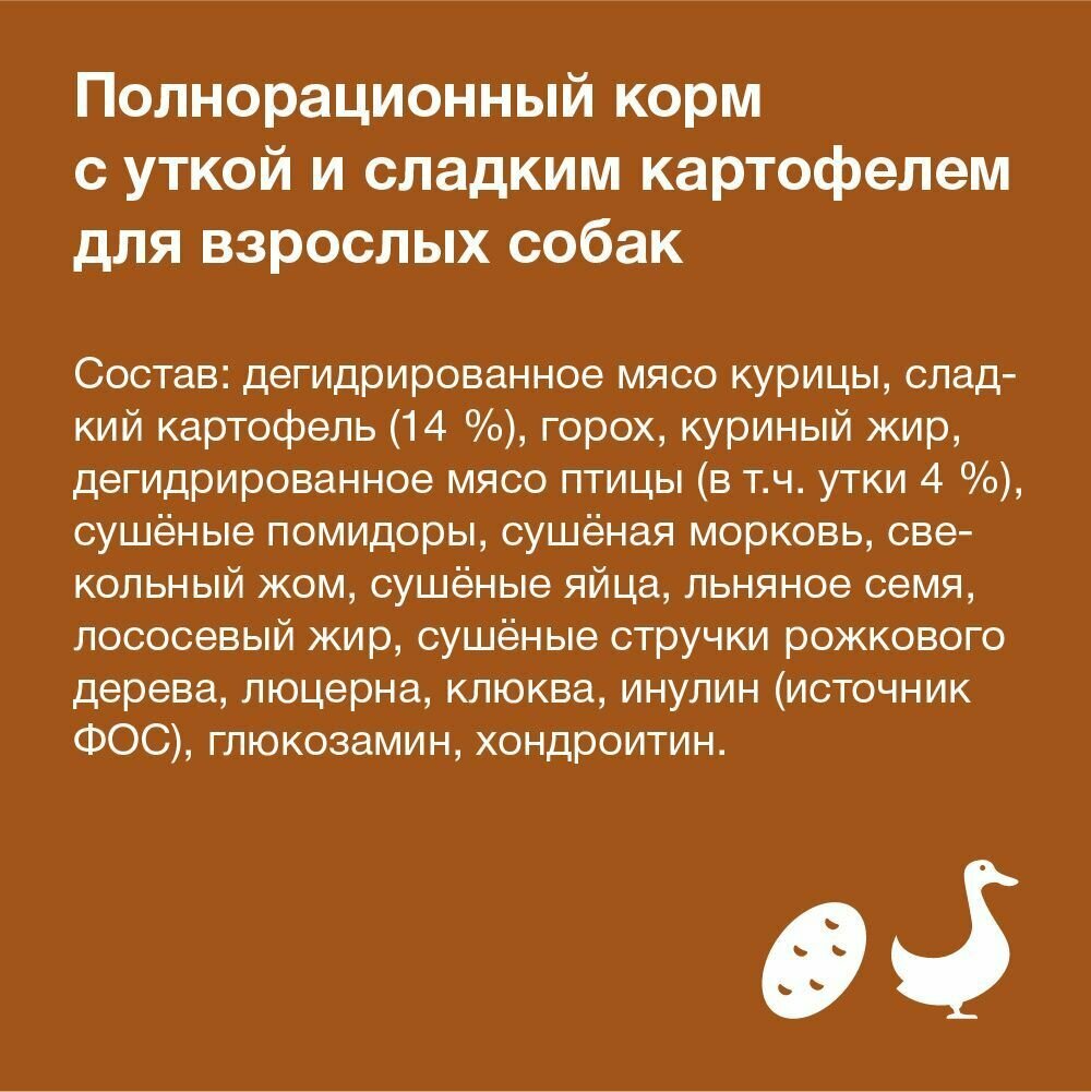 | Состав | дегидрированное мясо курицы, сладкий картофель (14%), горох, куриный жир, дегидрированное мясо птицы (в т.ч. утки 4%), сушеные помидоры, сушеная морковь, свекольный жом, сушеные яйца, льняное семя, лососевый жир, сушеные стручки рожкового дерева, люцерна, клюква, инулин (источник ФОС), глюкозамин, хондроитин |