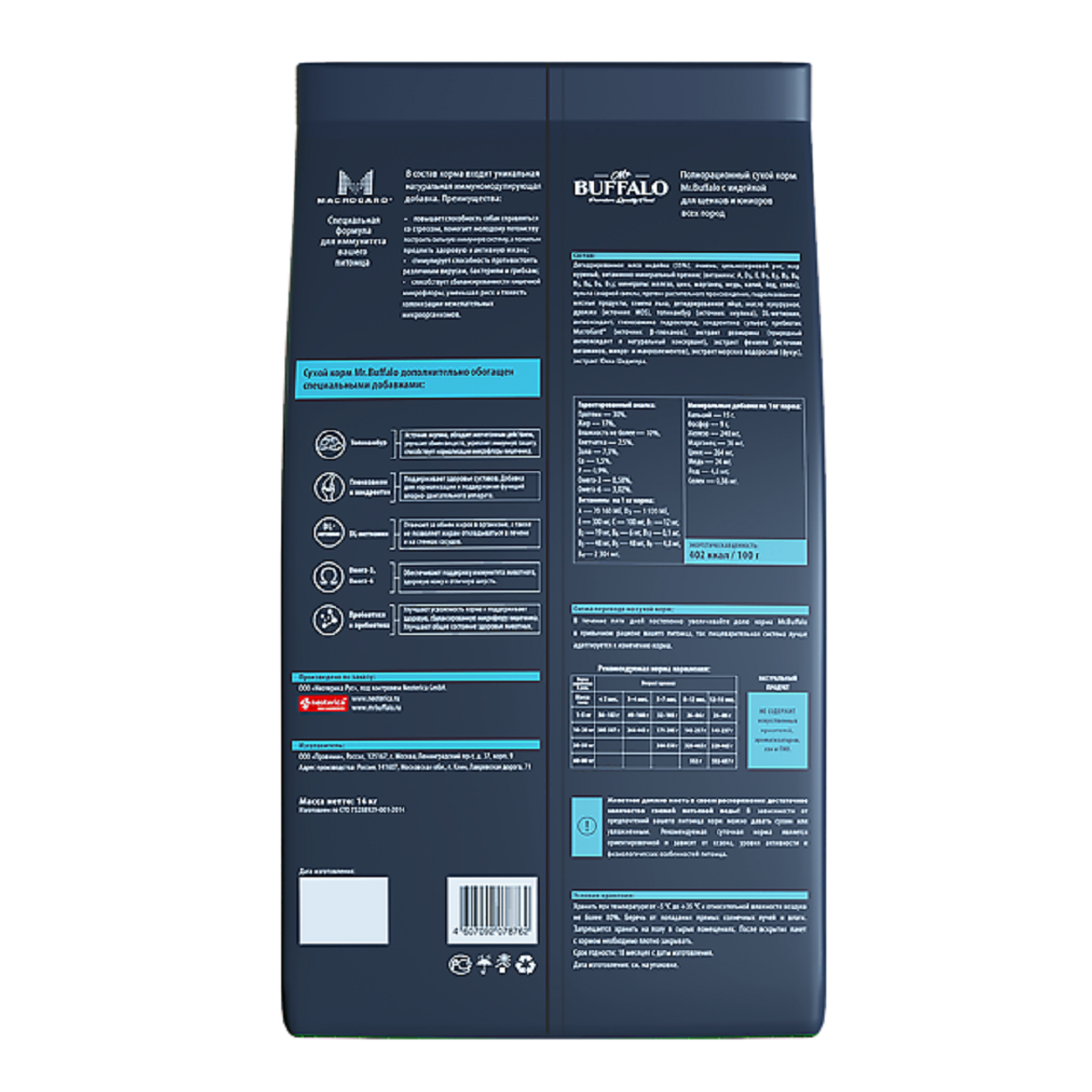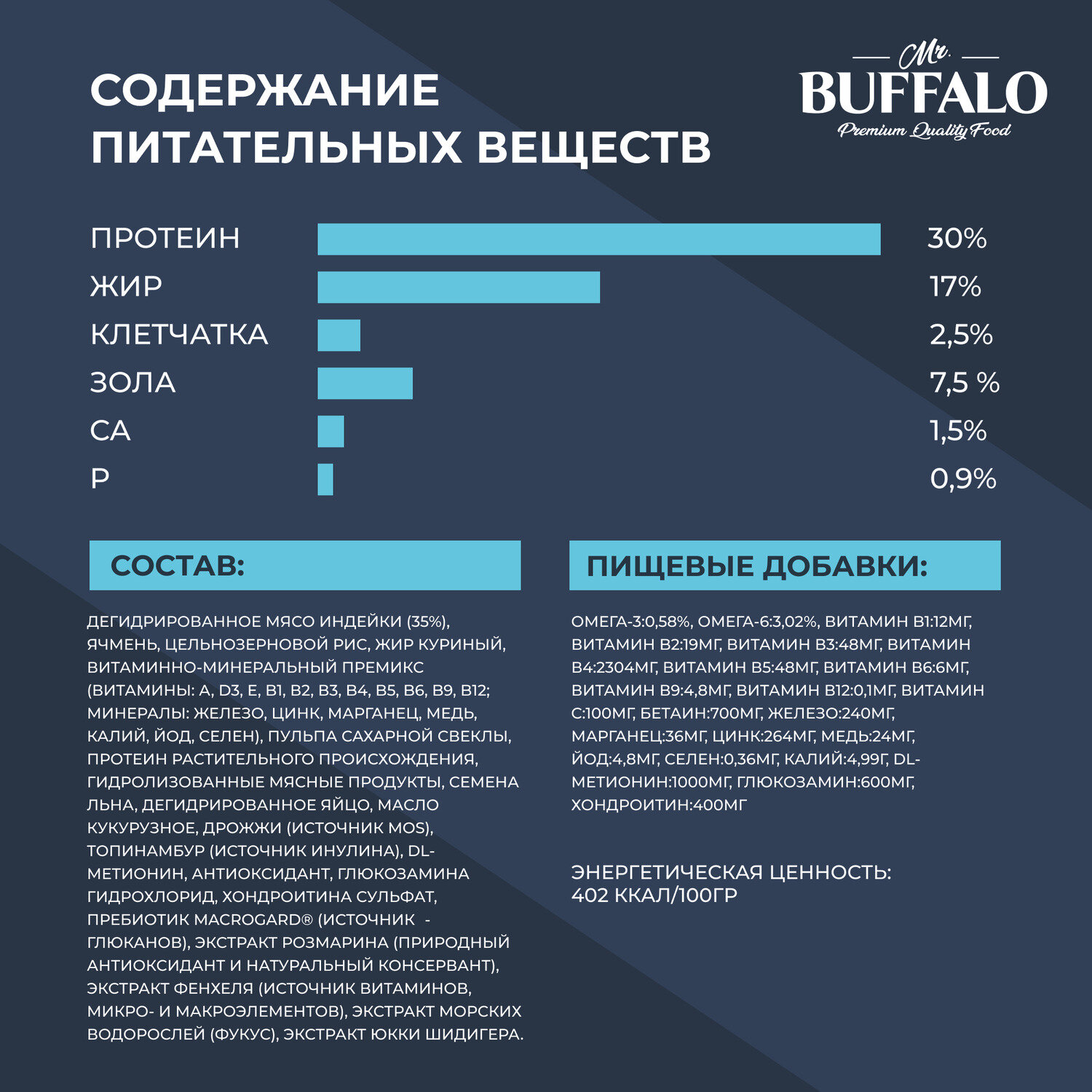 | Состав | дегидрированное мясо индейки (35%), ячмень, цельнозерновой рис, жир куриный, витаминно-минеральный премикс (витамины: А, D3, E, B1, В2, В3, B4, B5, B6, B9, B12; минералы: железо, цинк, марганец, медь, калий, йод, селен), пульпа сахарной свеклы, протеин растительного происхождения, гидролизованные мясные продукты, семена льна, дегидрированное яйцо, масло кукурузное, дрожжи (источник MOS), топинамбур (источник инулина), DL-метионин, антиоксидант, глюкозамина гидрохлорид, хондроитина сульфат, пребиотик MacroGard® (источник β-глюканов), экстракт розмарина (природный антиоксидант и натуральный консервант), экстракт фенхеля (источник витаминов, микро- и макроэлементов), экстракт морских водорослей (фукус), экстракт Юкки Шидигера |
