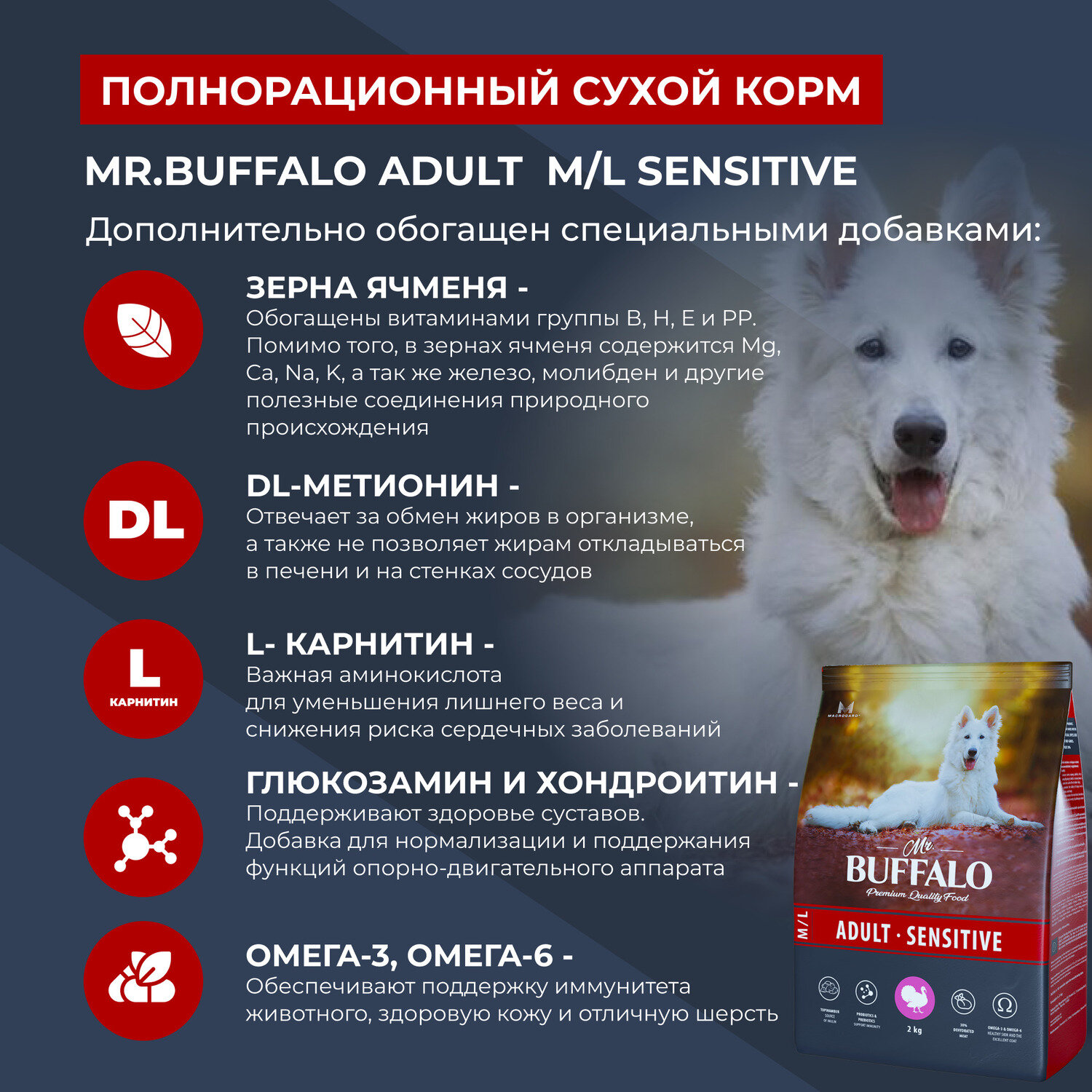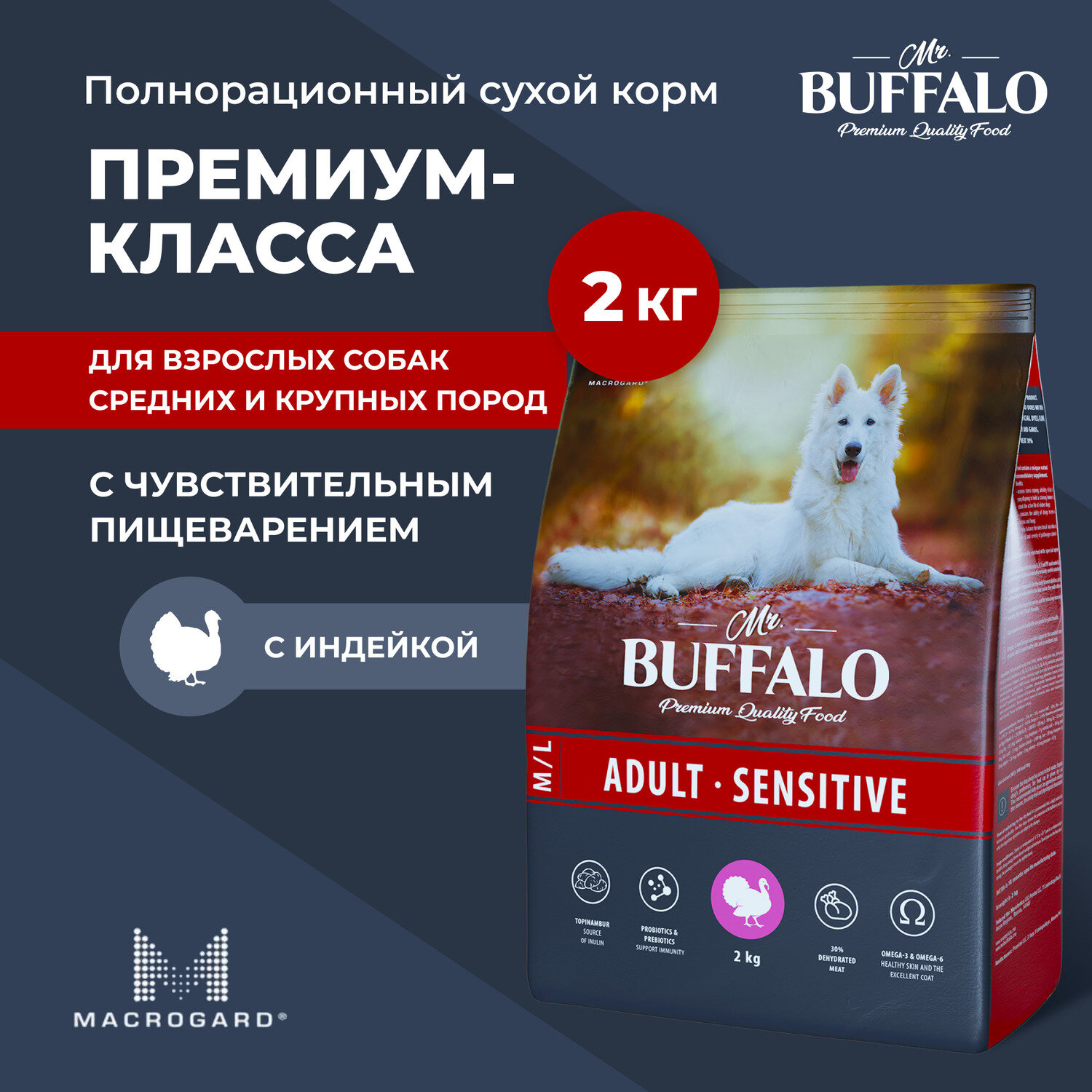 Корм Mr. Buffalo Adult Sensitive M/L для собак средних и крупных пород с чувствительным пищеварением, с индейкой, 2 кг