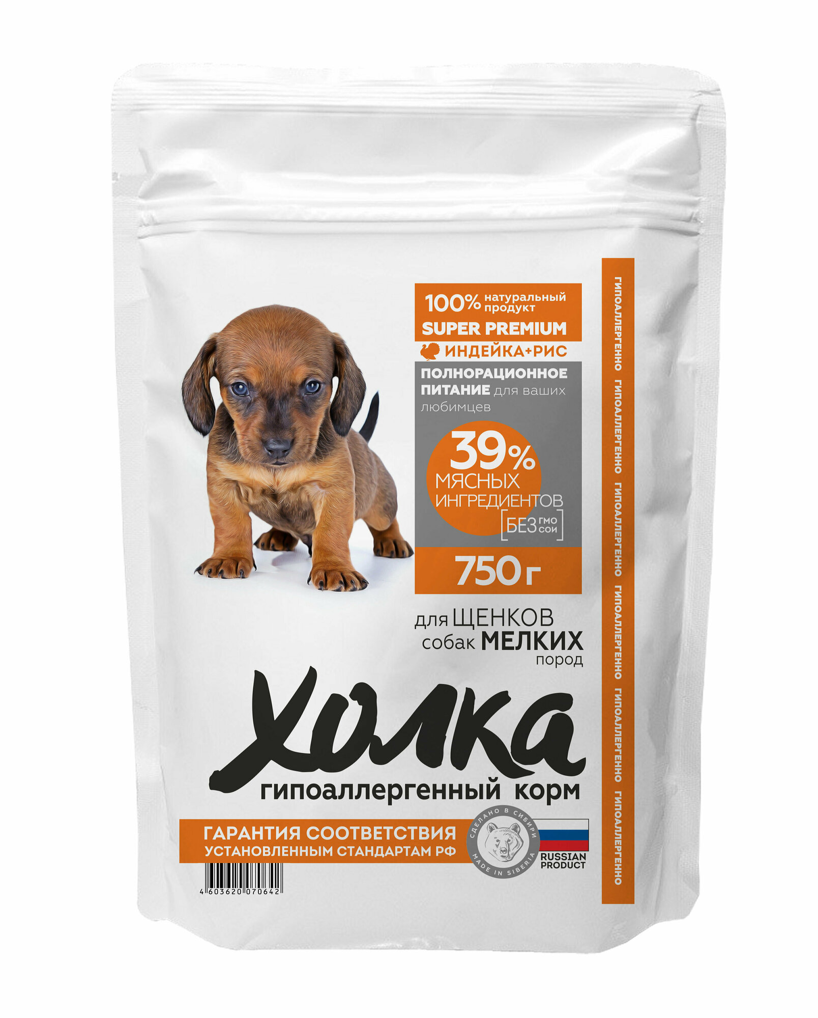 Корм холка гипоаллергенный премиум класса для щенков собак мелких пород с индейкой и рисом, 750 гр.
